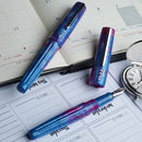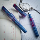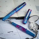 Joyful Saturday, features a vibrant color combination of purple and bright blue, enhanced by sparkling silver shimmer. Enjoy a crisp and precise writing experience with its size #6 Schmidt nib and convenient cartridge/converter system.