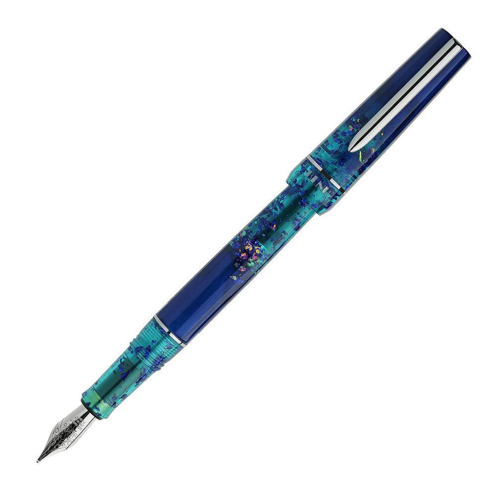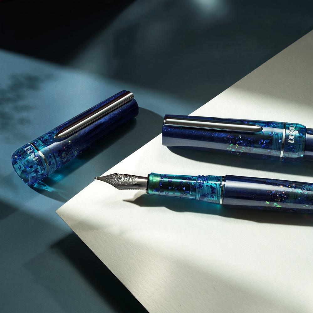 The Allure fountain pen combines striking teal and ocean blue hues with shimmering glitter and polished chrome accents. Its captivating design truly embodies elegance with each line you write. This set includes a standard international converter and a long blue ink cartridge for seamless writing.