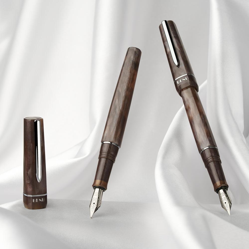 The Satin fountain pen showcases smoky gray marbling paired with sleek chrome accents, embodying refined modern style. Its design is subtly elegant, delivering a writing experience as smooth as silk flowing with ink. Comes complete with a standard international converter and a long blue ink cartridge.