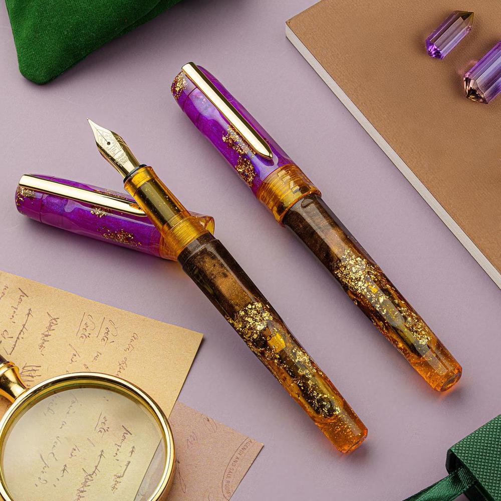 Ametrine, inspired by the striking beauty of this naturally occurring blend of amethyst and citrine, features a bold combination of brown and purple hues and is fitted with a #6 Schmidt gold-plated nib and clip. Each Talisman pen comes with a leaflet describing the historical and symbolic significance of the corresponding stone.