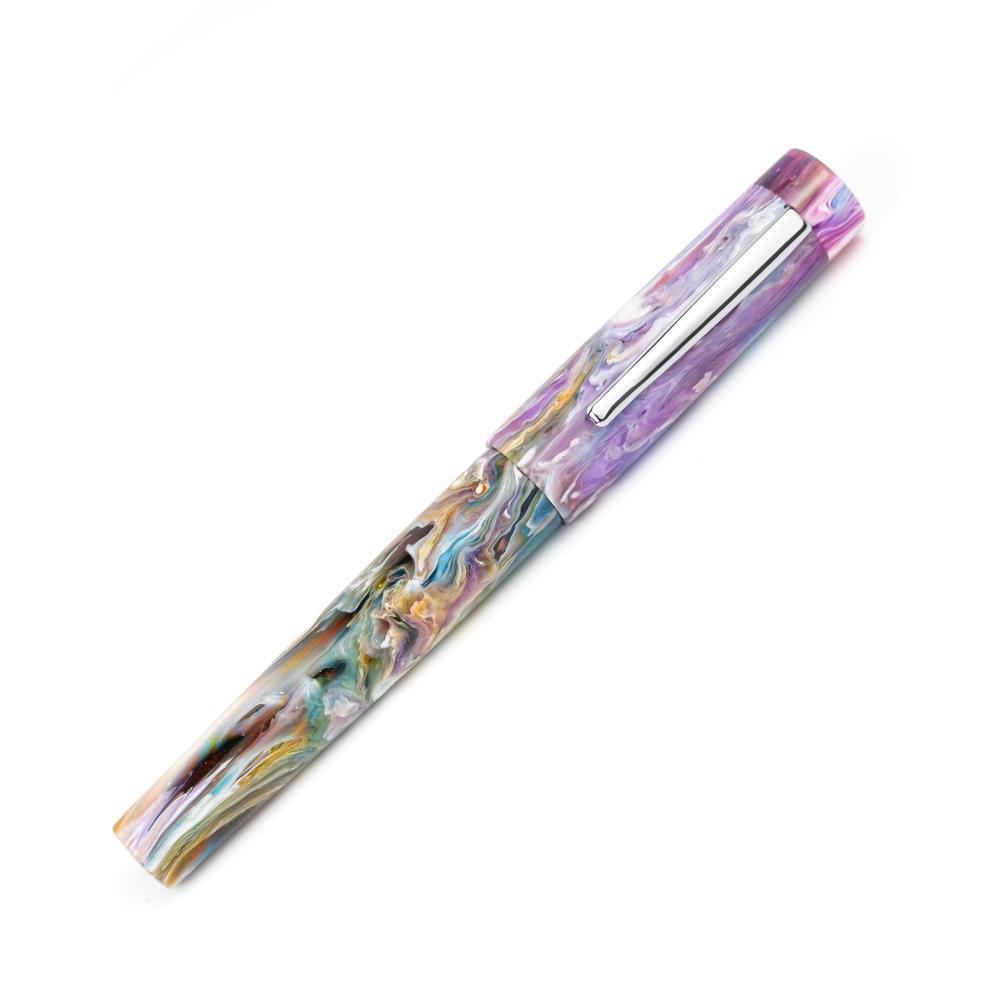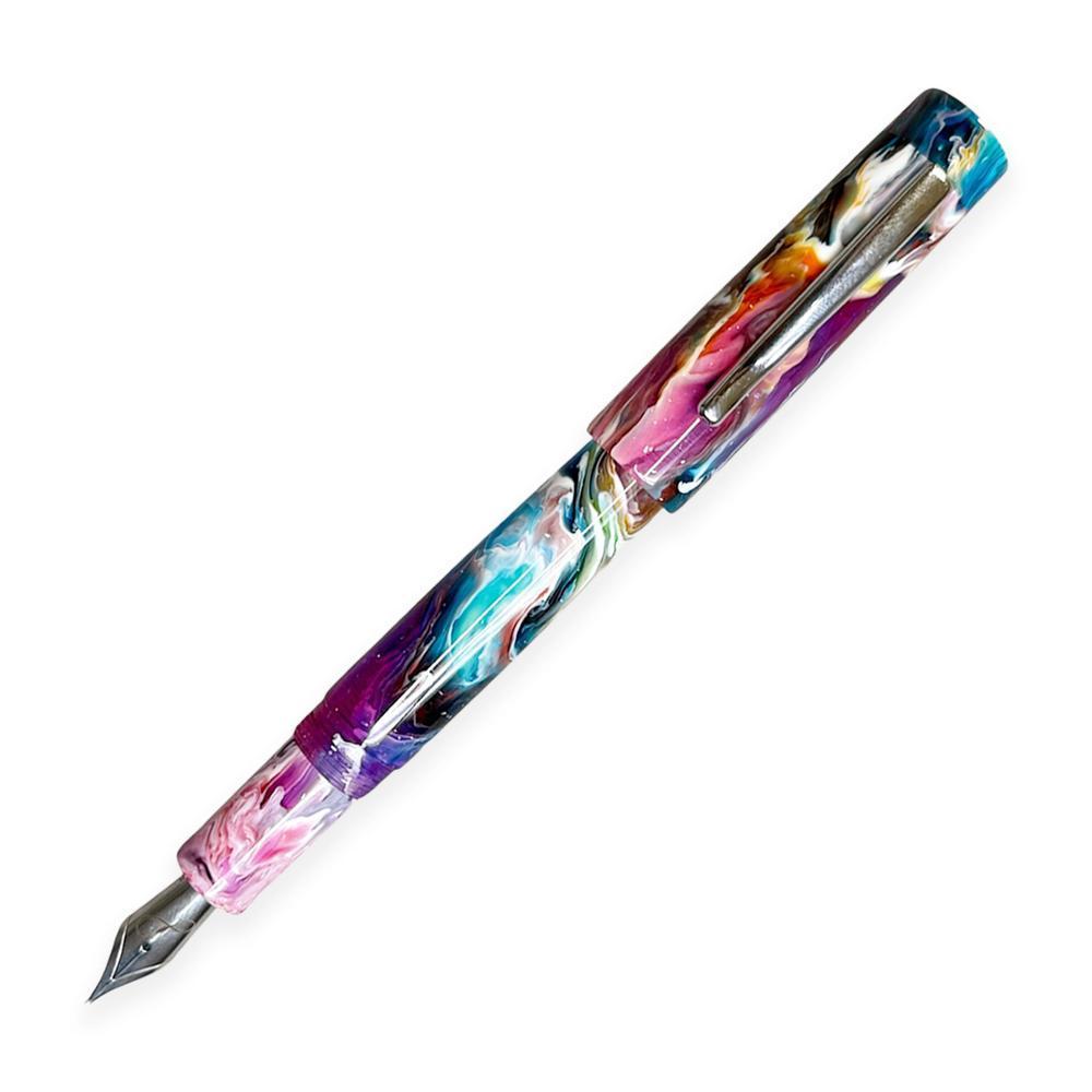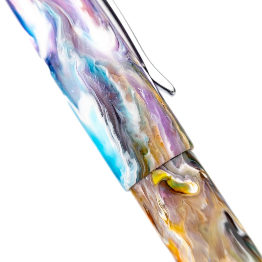 This numbered edition beauty showcases Jonathan Brooks' latest resin artistry with a refined design: pinched front section, graceful body taper, flat cap and body ends, minimal threading step, and elegant silver clip. The top cap is engraved with the EndlessPens logo along with the numbered edition.