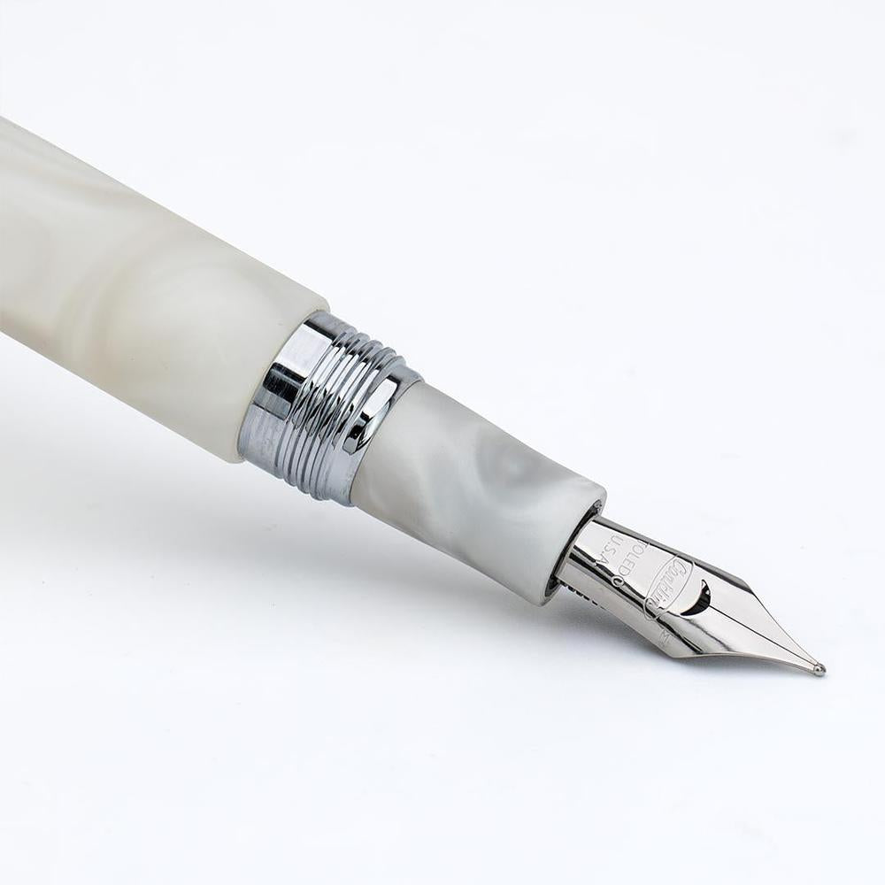 The Conklin 1898 Spectra Fusion White is a stunning limited edition fountain pen that captivates with its striking aesthetic. This exclusive 2025 release showcases a beautiful marriage of pristine white epoxy and natural wood warmth, creating a one-of-a-kind visual experience with its enchanting translucency and dynamic color play. Elegant polished silver accents elevate its sophisticated appeal, making it a true collector's piece. Designed for both convenience and performance, it works with standard ink cartridges or the included threaded converter for easy refilling. Each pen is meticulously crafted with a precision-engineered nib and plasma-treated feeder, delivering consistently smooth writing and exceptional control that makes every stroke a pleasure.