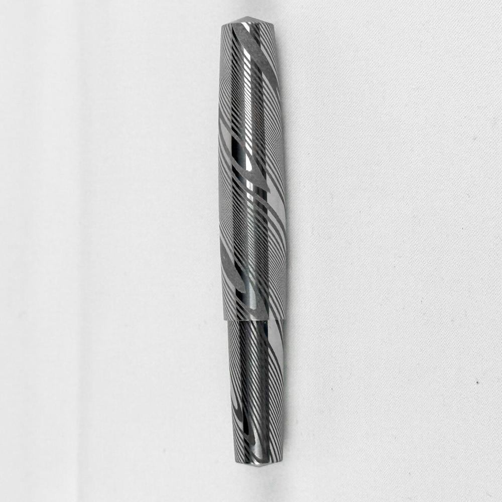 The fountain pen is compact, portable, and practical, with a focus on the unique materials it's crafted from. Introducing new materials to the Gravitas lineup, the Damascus Steel used in the Dinkey is created by layering and bonding various steel alloys. This process results in a distinctive, textured surface that creates a striking visual effect. As a premium material, Damascus Steel offers both durability and aesthetic appeal, accompanied by a price that reflects its exceptional quality and craftsmanship.