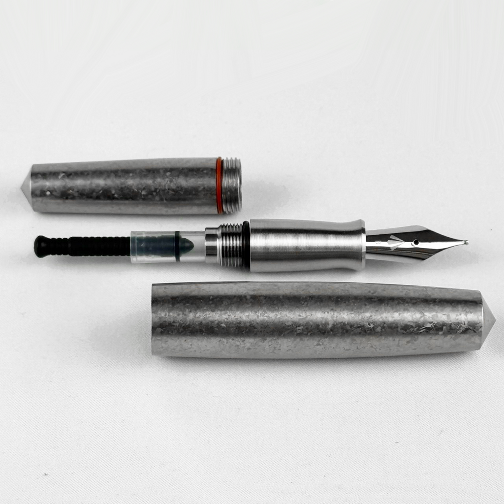 A highly portable and durable pocket pen, expertly redesigned for those constantly on the move. The barrel and cap are precisely machined from a solid bar of Grade 5 Titanium brought to a high temperature and let to cool down for days in order to let it show a raw crystallized texture, the section is machined out of Stainless Steel for weight balance. The new Pocket Crystalized Titanium offers an integrated Delrin insert in the cap, granting a smooth posting experience that leaves no marks attributed to posting.
