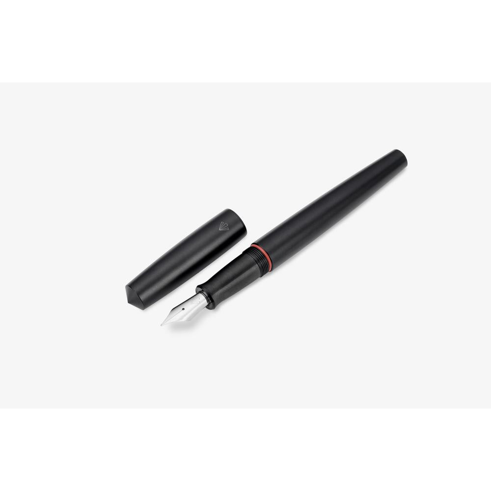 The 25mm-long section, tapering from 13.25mm to 11.5mm, is expertly crafted from Stainless steel alloy - PvD coated in black and features finely machined circular grooves for an enhanced grip. Machined from a single block of Aluminium the cap and the barrel are anodised in black color and a matte texture.