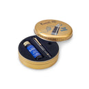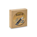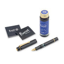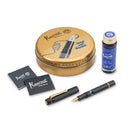 The Kaweco Sport Piston Fill Starter Set includes a gold-plated steel-nibbed fountain pen and a 32 ml bottle of Kaweco Royal Blue, packaged in a tin box.