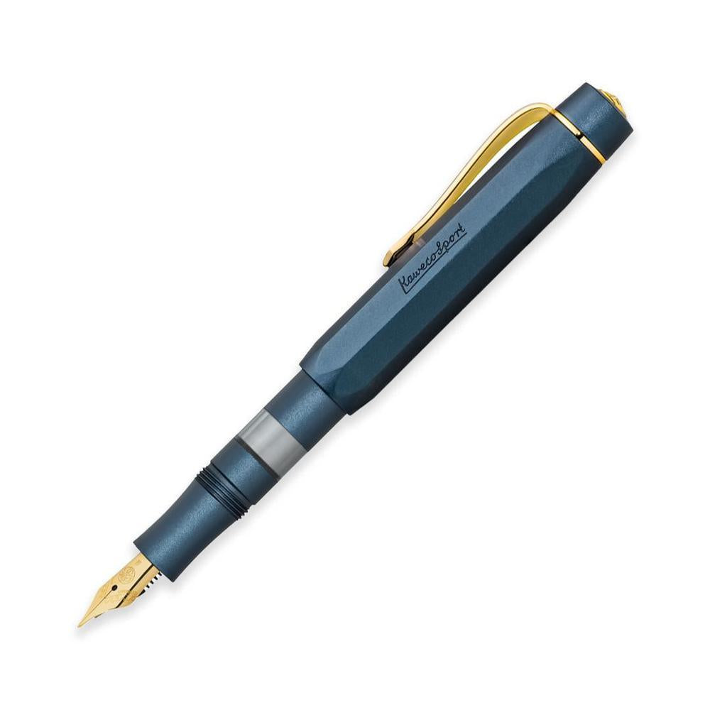 The Piston Sport AL series introduces a vibrant touch with its navy blue anodized aluminum body, complemented by elegant gold accents that enhance its refined appeal. This fountain pen features a gold-plated steel nib available in five sizes, ranging from extra fine (EF) to extra broad (BB), and the 190 nib unit is easily interchangeable. Similar to the black piston filler model, you can select a Starter Set that includes a royal blue ink bottle or opt for the Solo version without ink. Presented in a classic Kaweco round tin box, the Piston Sport AL Navy makes a sophisticated gift choice for any occasion.
