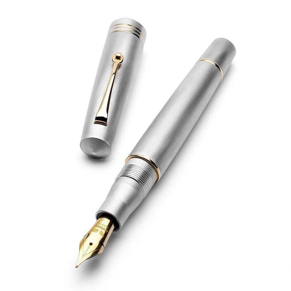 Constructed from solid aluminum bar, with a brushed finish and colorless treatment on the surface for long-lasting durability and a pearlescent glow. Features a #6 La Fenice 14K gold nib and available in two elegant trims: Gold and Silver.