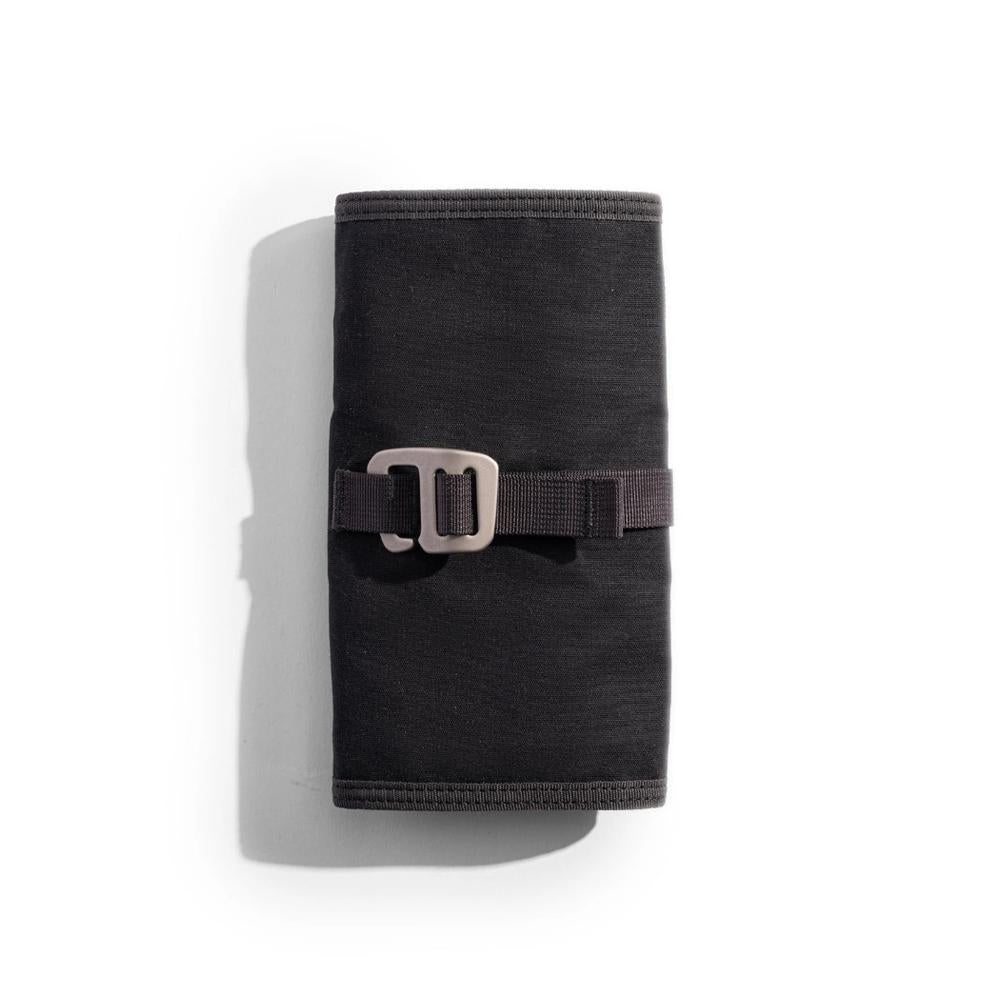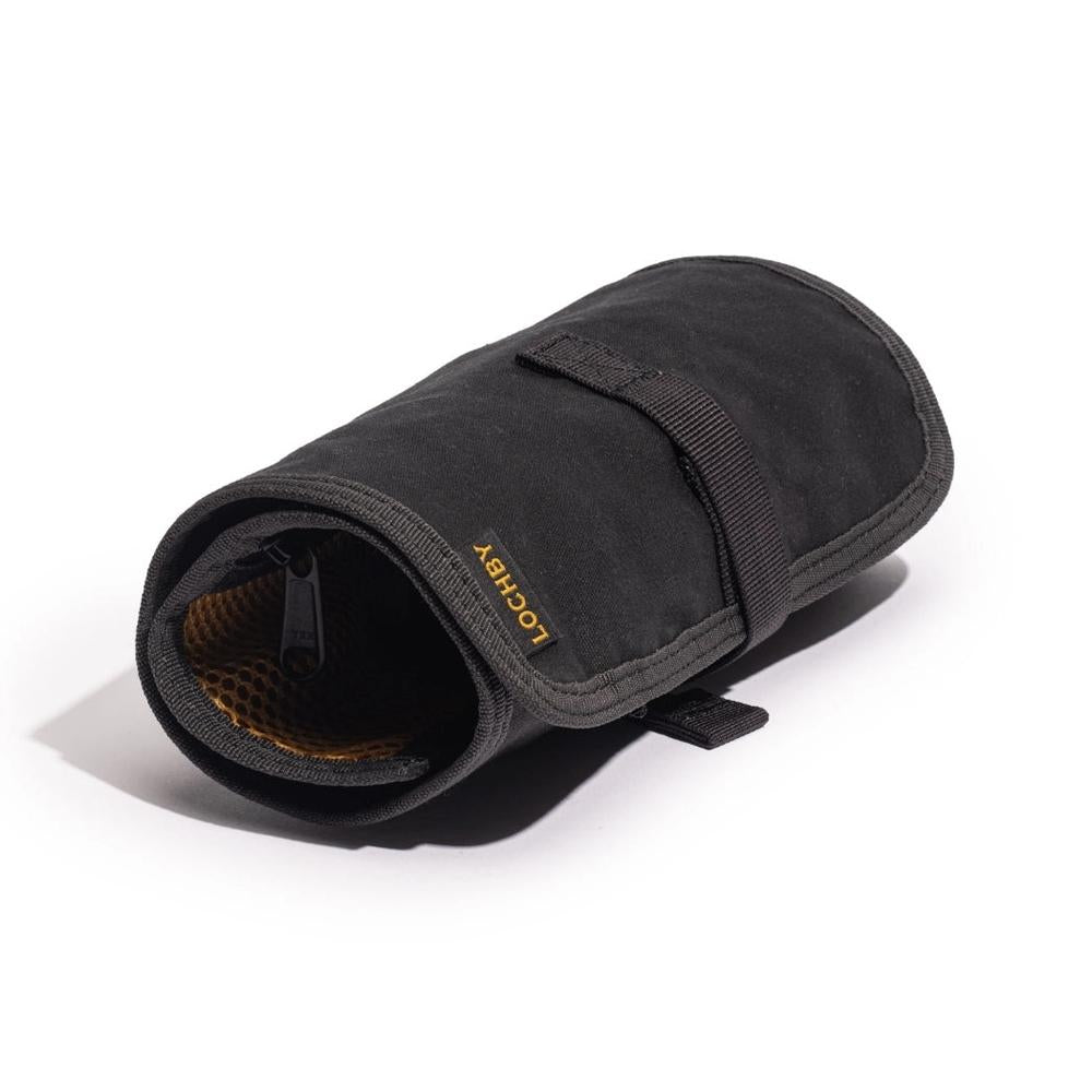 A timeless item that has been modernized for efficiently carrying our current tools. Perfect for organizing pens, toiletries, cycling gear, art supplies, or medical supplies. The possibilities are limitless. Durable waxed canvas is resistant to water and abrasion. A heavy-duty aluminum hook securely fastens everything in place, with three pockets and elastic to keep items secure. Double stitching and bartacking are used throughout. This product is vegan-friendly.