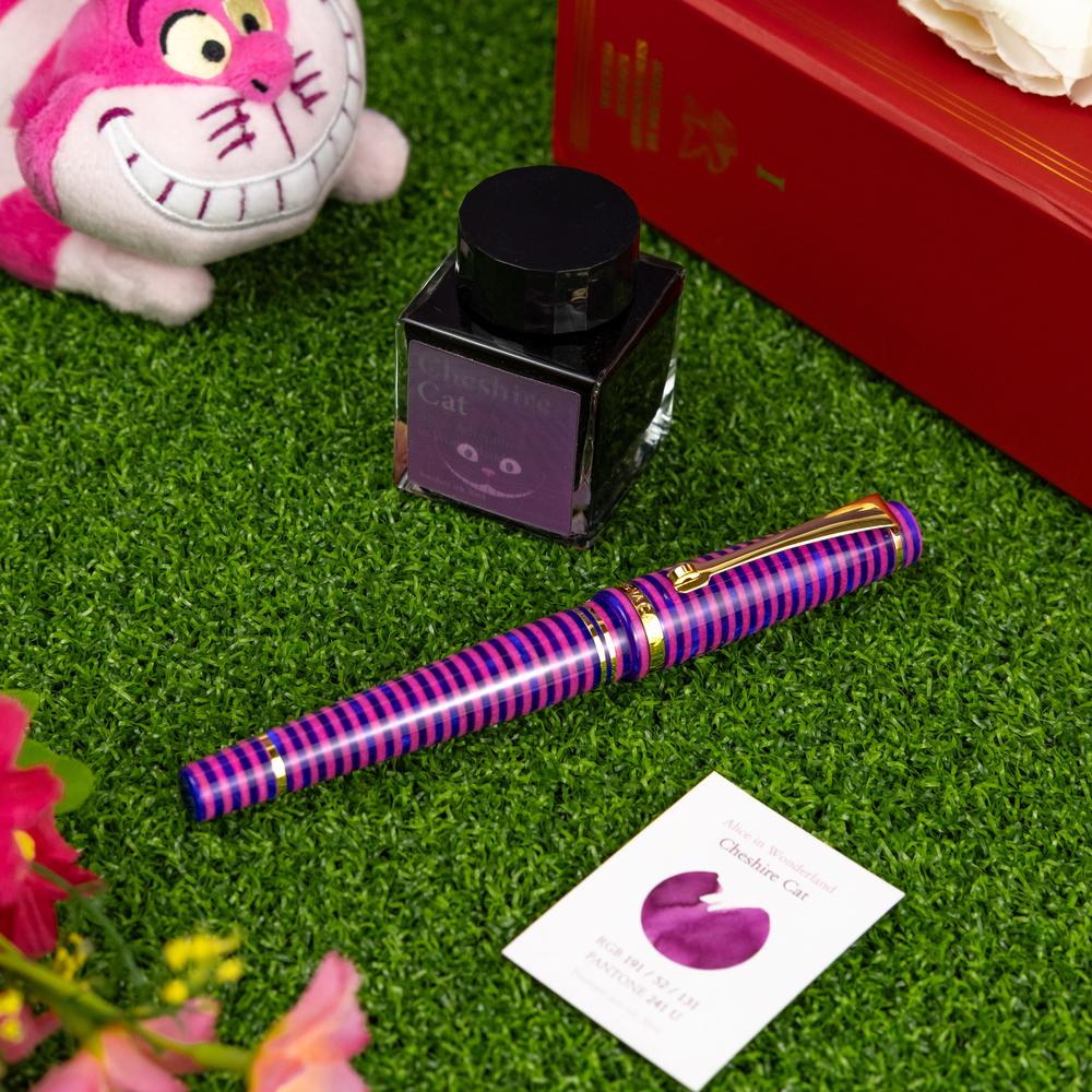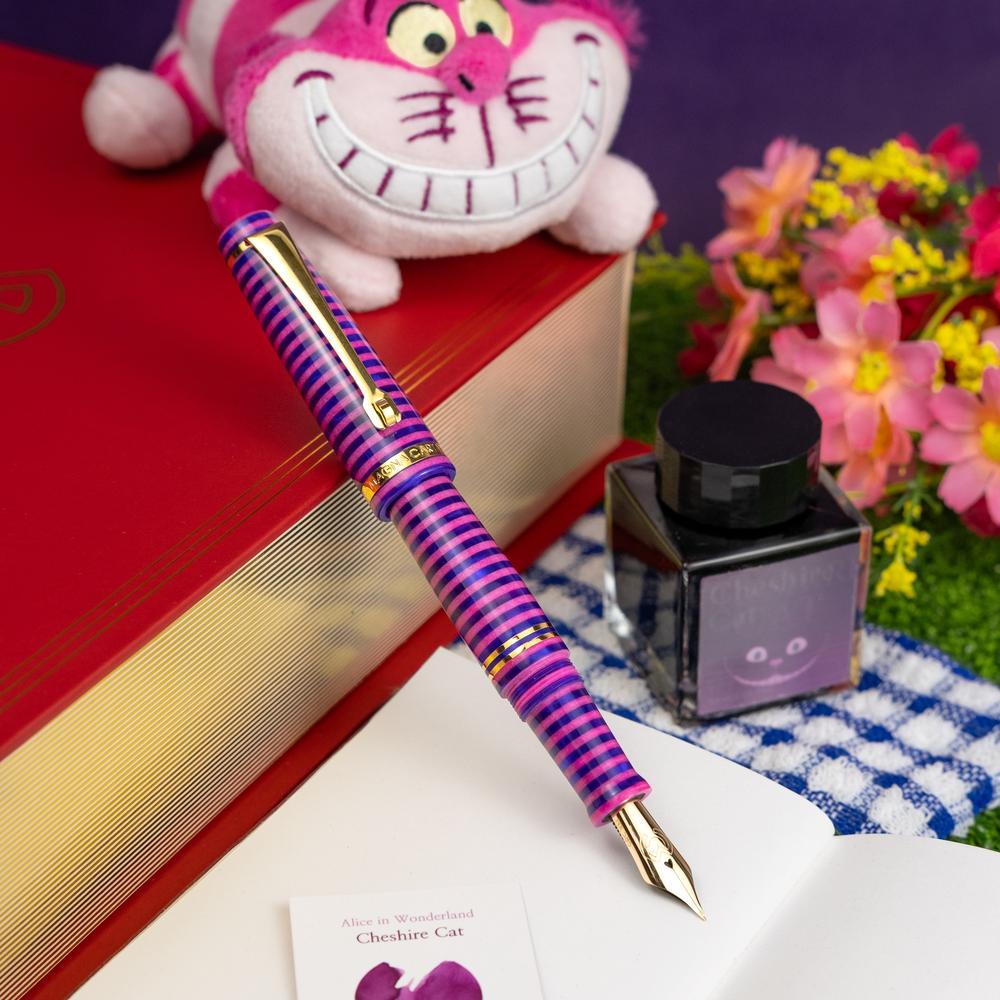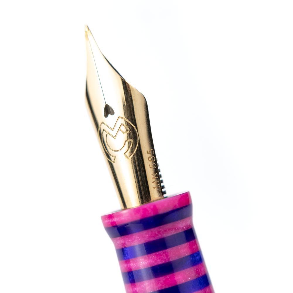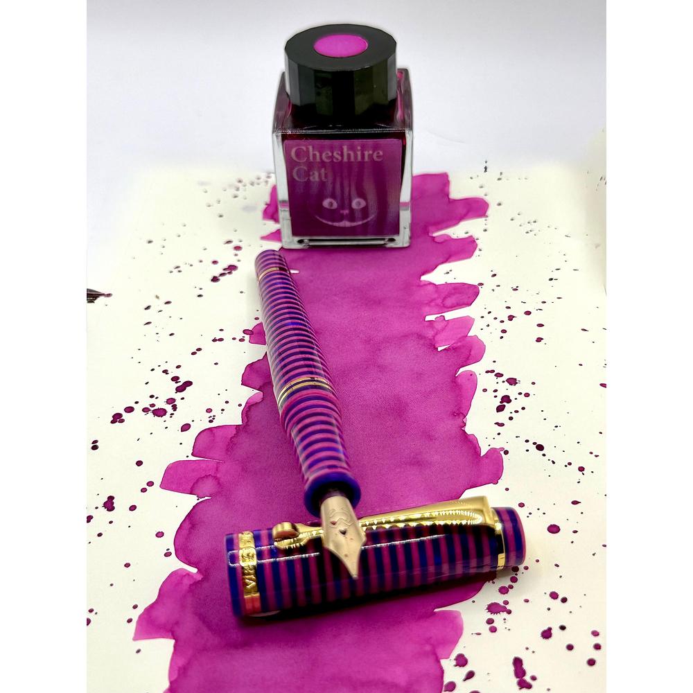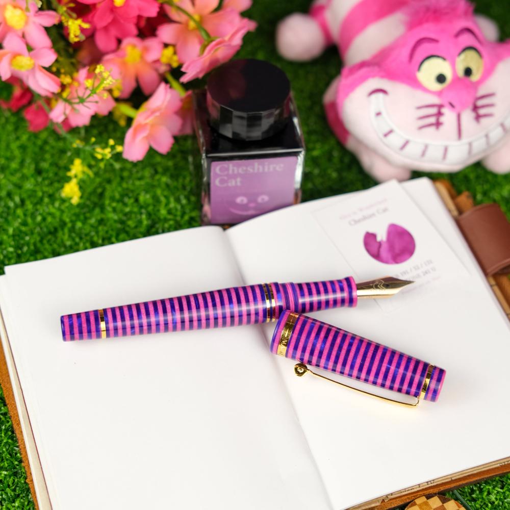 The MST Cheshire fountain pen showcases a striking stacked resin design and is equipped with a 14K gold #6 Flex Fine nib. Enhanced with elegant gold accents, it operates on a cartridge/converter system. Elevate your collection by adding the Wearingeul Cheshire Ink Bottle for only $10.