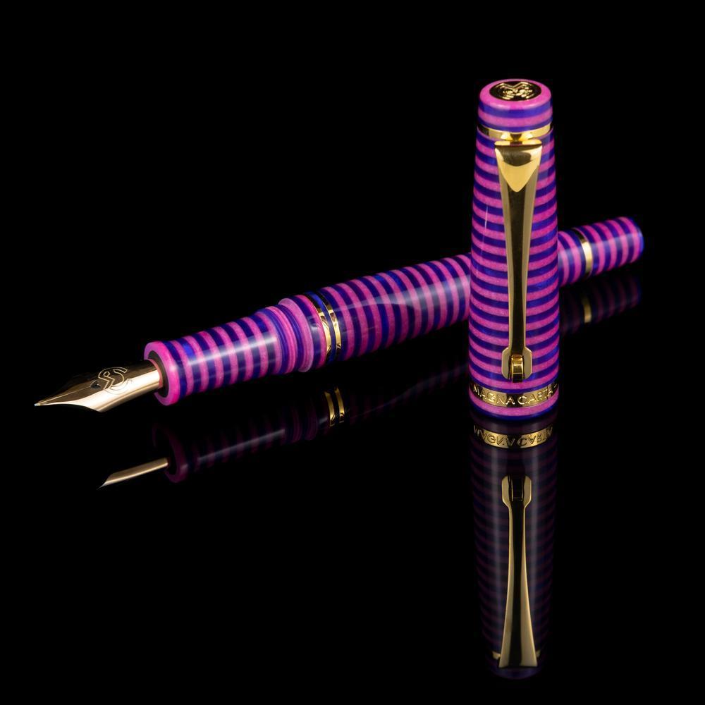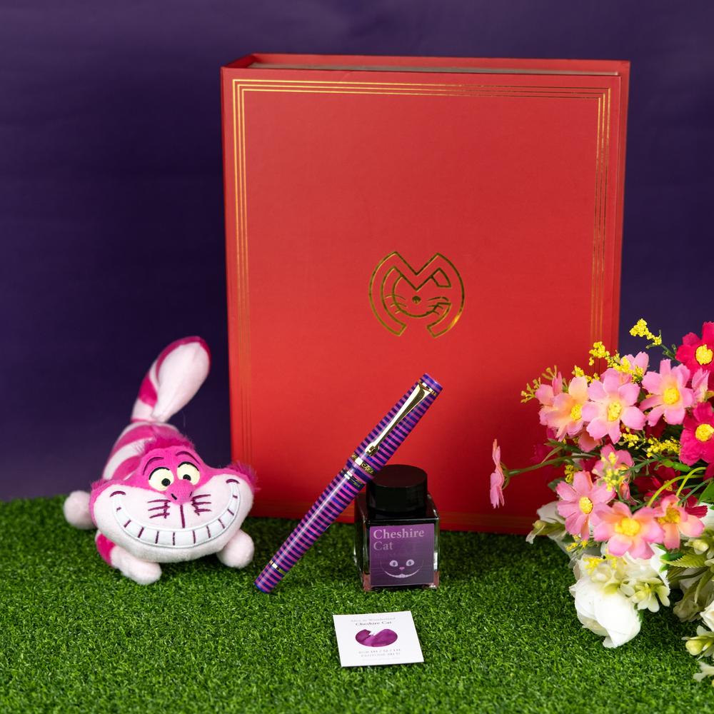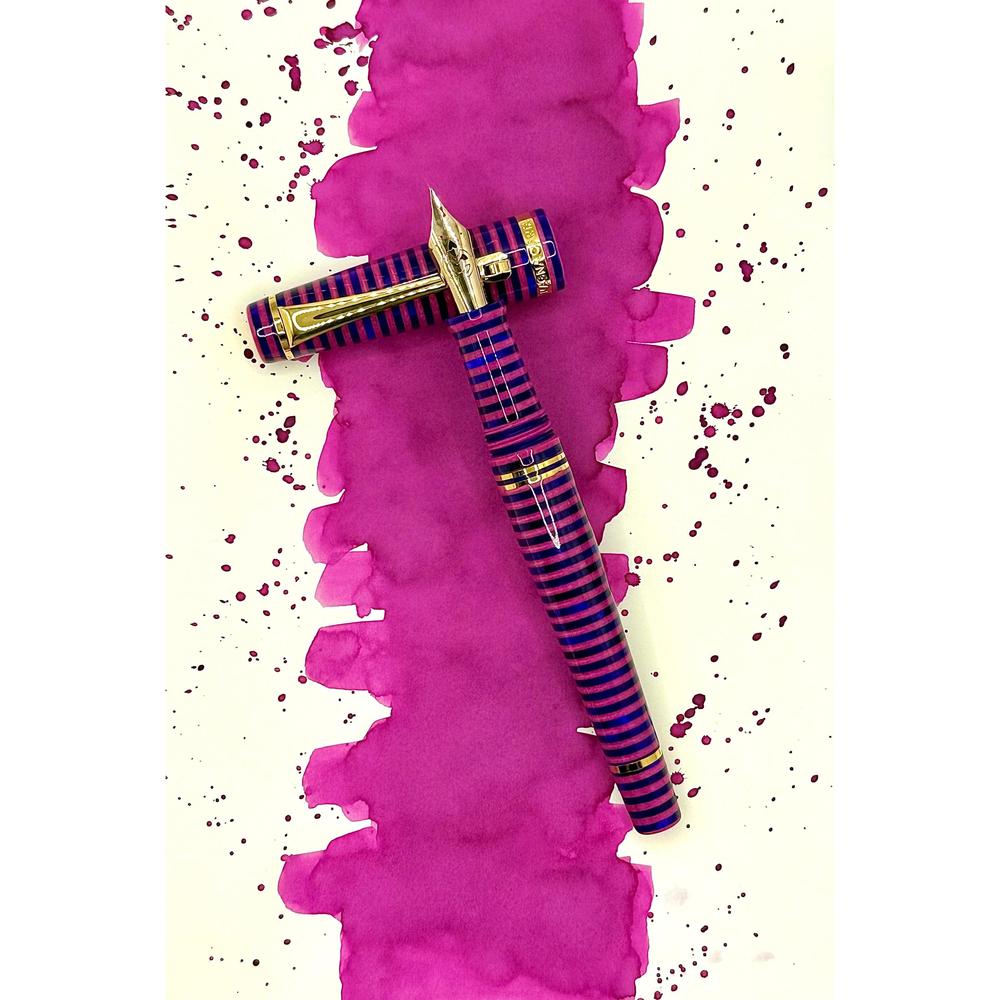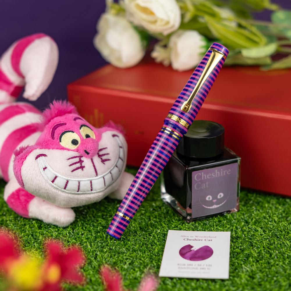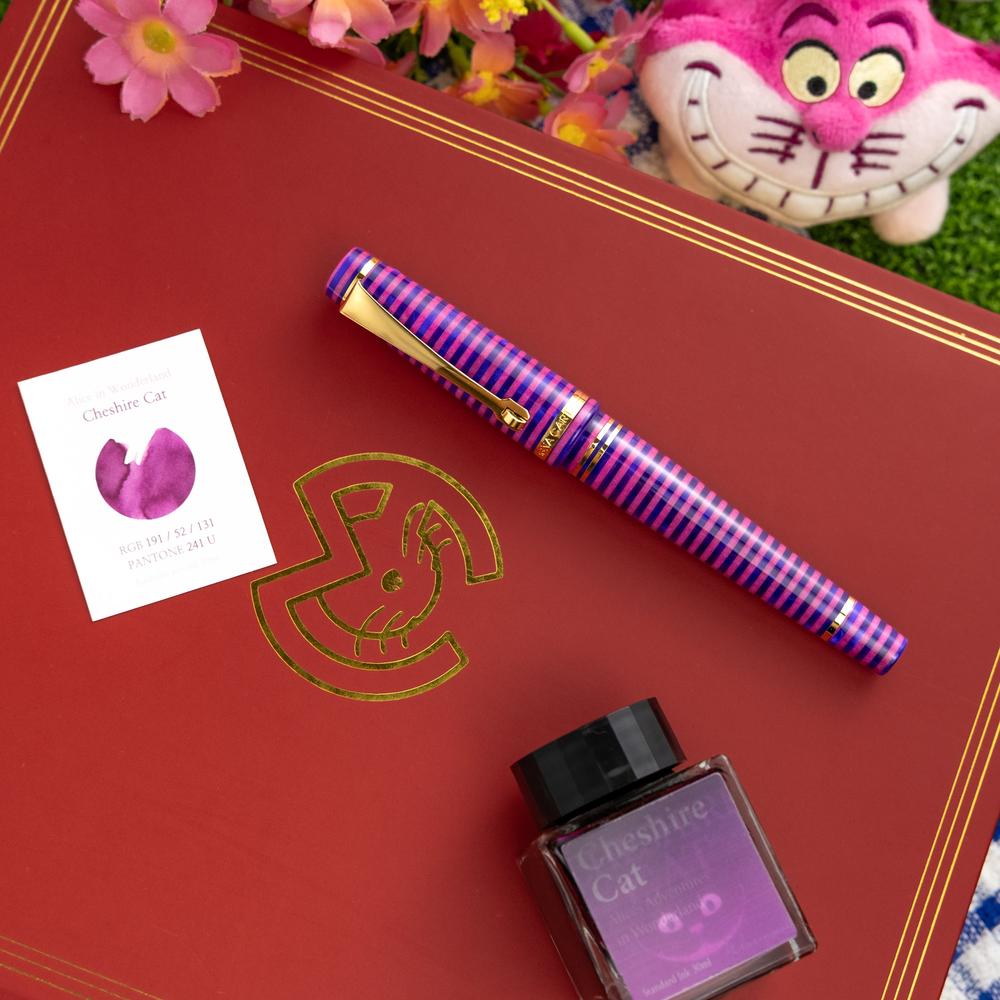 The MST Cheshire fountain pen showcases a striking stacked resin design and is equipped with a 14K gold #6 Flex Fine nib. Enhanced with elegant gold accents, it operates on a cartridge/converter system. Elevate your collection by adding the Wearingeul Cheshire Ink Bottle for only $10.