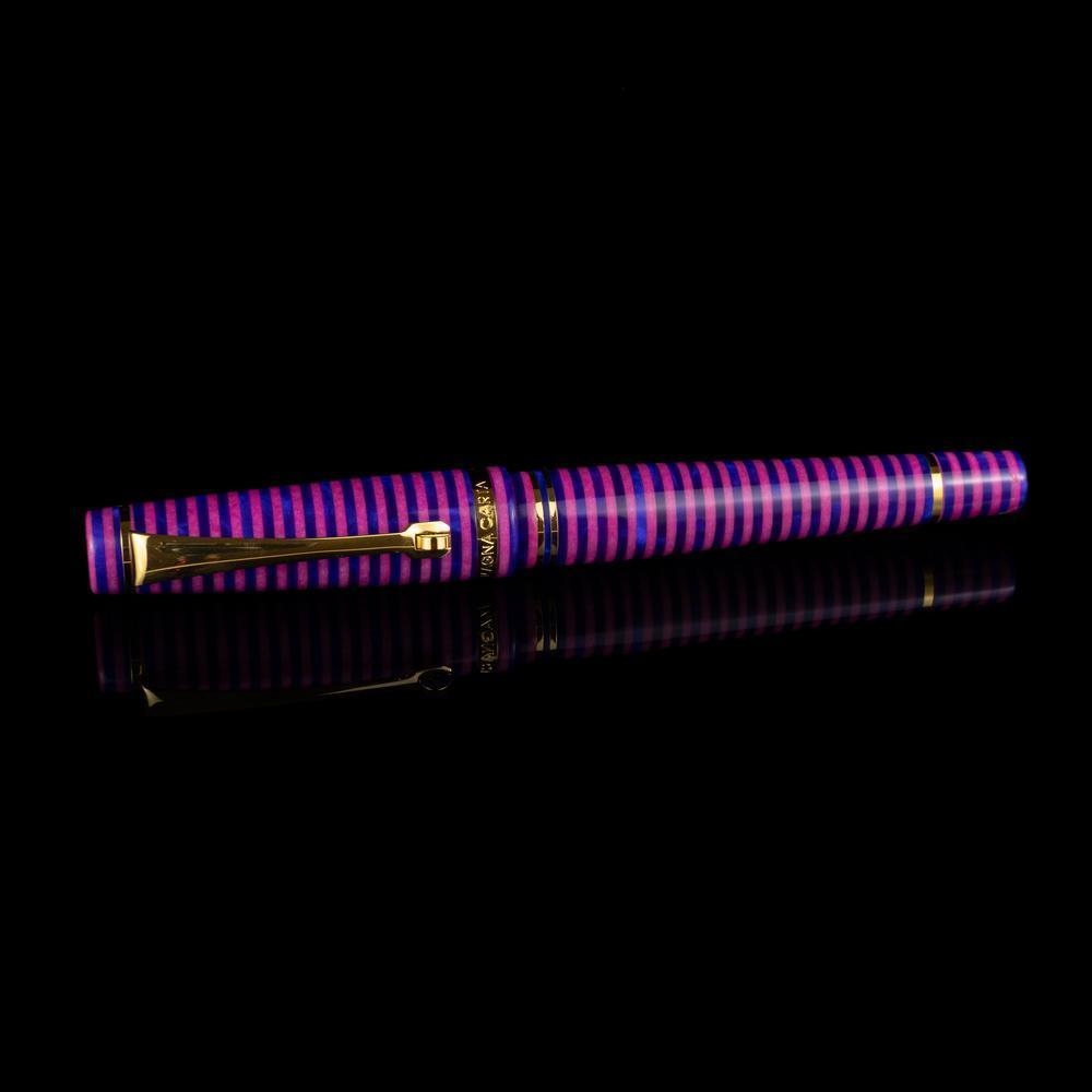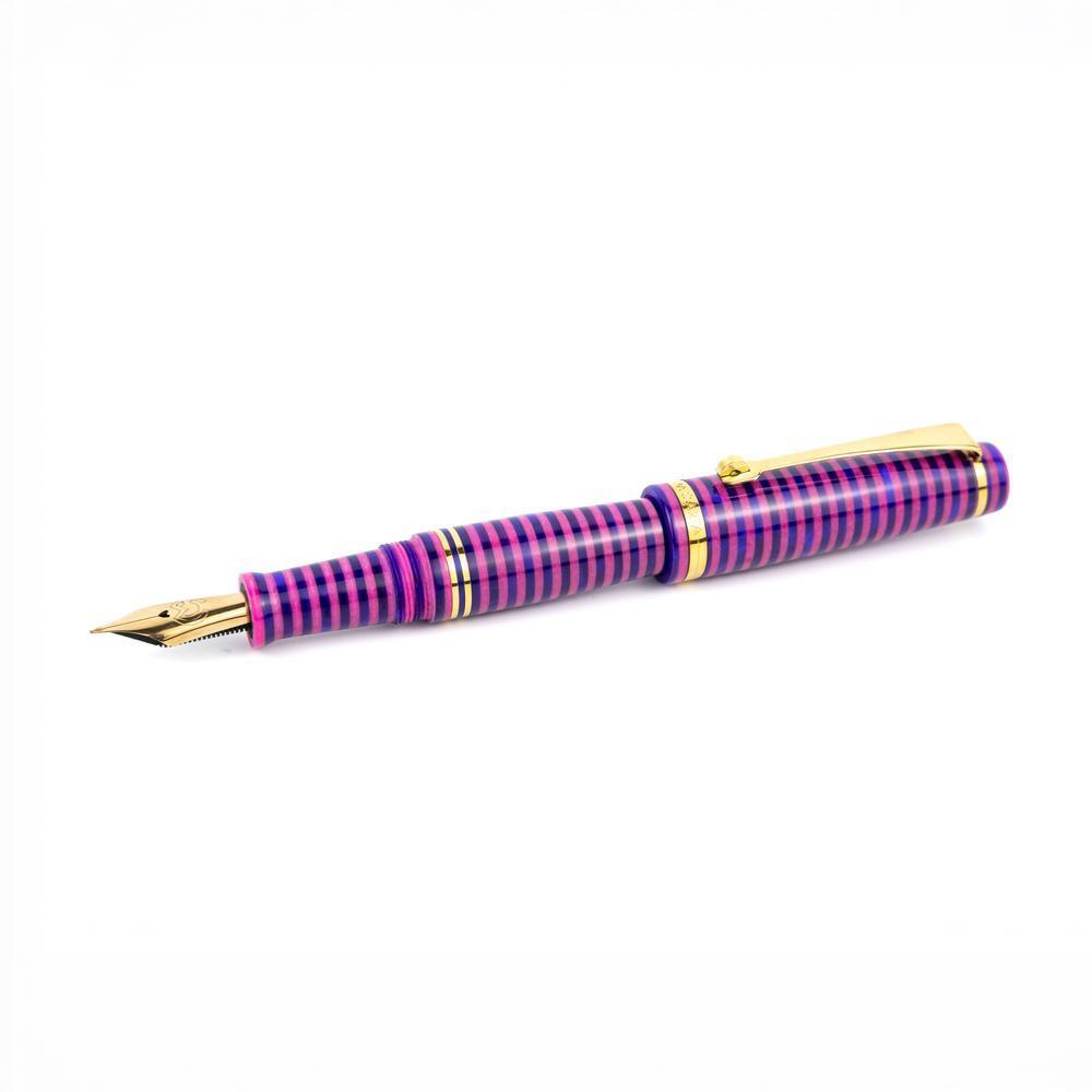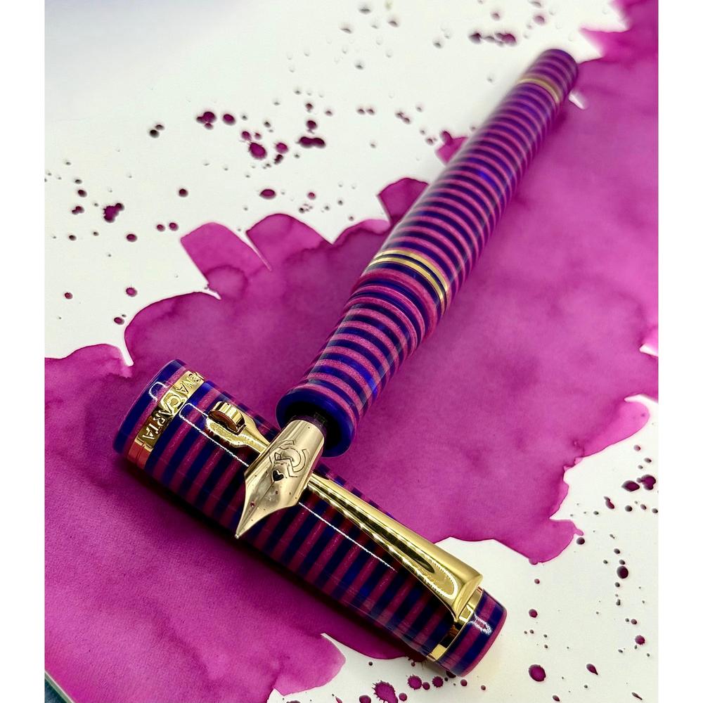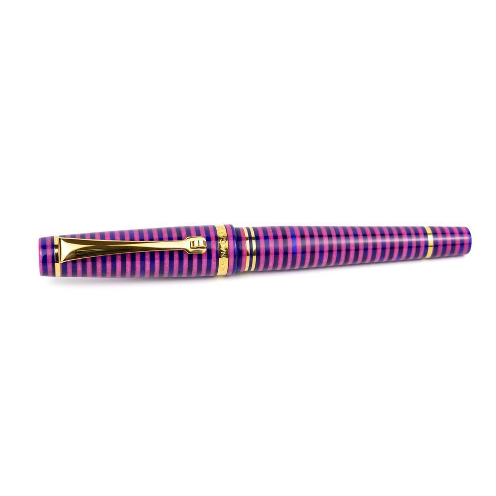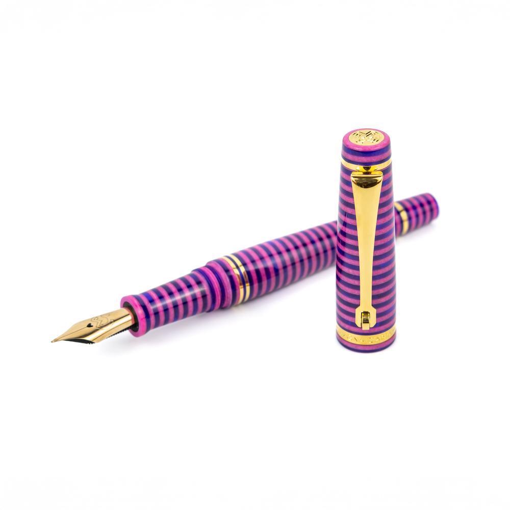 The MST Cheshire fountain pen showcases a striking stacked resin design and is equipped with a 14K gold #6 Flex Fine nib. Enhanced with elegant gold accents, it operates on a cartridge/converter system. Elevate your collection by adding the Wearingeul Cheshire Ink Bottle for only $10.