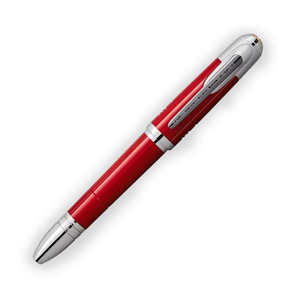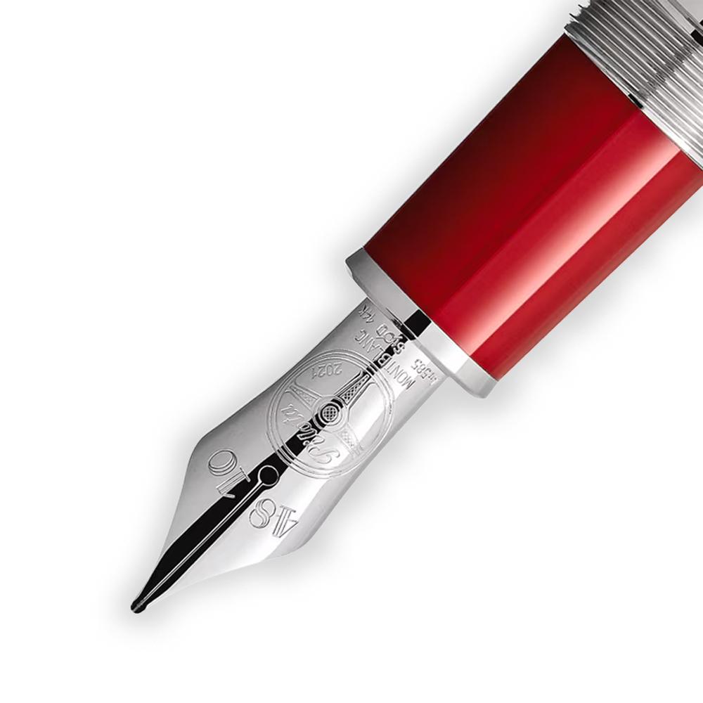 Montblanc celebrates the legendary Enzo Ferrari with this stunning 2021 special edition fountain pen. Crafted from vibrant red precious resin, the design draws inspiration from "Rosso 70 Anni," the iconic red created for Ferrari's 70th anniversary, honoring the racing passion that defined an empire. The cap features the Montblanc emblem on a yellow accent—a nod to Modena—while the prancing horse emblem adorns the back. A meaningful Enzo Ferrari quote graces the metal clip: "We cannot describe passion, we can only live it." The 14k gold nib is hand-engraved with the steering wheel from the legendary Ferrari 250 GTO and the nickname "Pilota," capturing the spirit of a visionary who transformed automotive history. A collector's treasure for enthusiasts of fine writing instruments and automotive heritage.