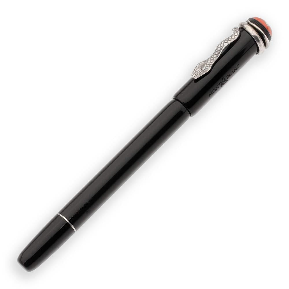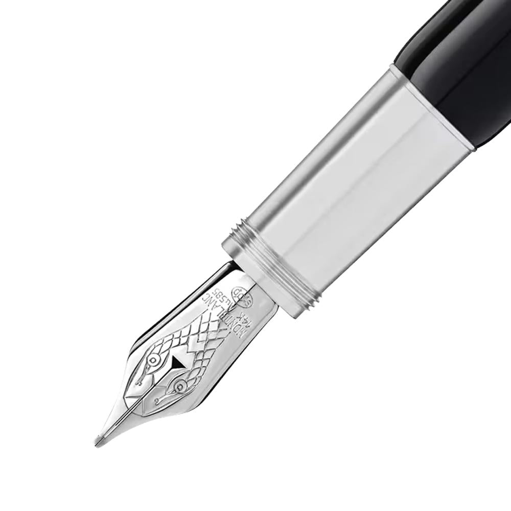 The Montblanc Heritage Rouge et Noir fountain pen honors over a century of writing innovation. Originally introduced in 1906 as a revolutionary self-filling design, this modern reinterpretation combines timeless elegance with contemporary craftsmanship. The pen features a refined, slender profile paired with advanced piston filler technology for smooth, reliable writing. Its striking black precious lacquer barrel and resin cap create a sophisticated aesthetic, while the vintage-inspired snake clip—crafted through specialized metalworking and authentic aging techniques—adds distinctive character. A true collector's piece that bridges heritage and modern design.