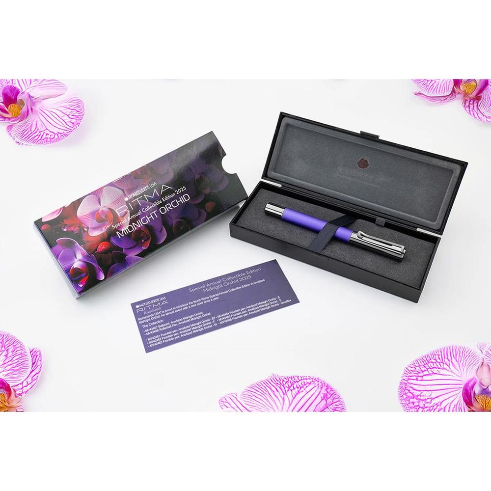 Experience the allure of Monteverde's 2025 Ritma™ Special Edition in Midnight Orchid—a stunning deep purple fountain pen that marries vintage-inspired design with modern innovation. Featuring a luxurious matte finish complemented by polished gunmetal accents, this collectible pen draws aesthetic inspiration from the iconic minimalism of mid-century design. The ingenious magnetic cap ensures effortless operation, while its perfectly balanced construction delivers a smooth, satisfying writing experience. Crafted as an exclusive annual release, Midnight Orchid transforms everyday writing into an elegant ritual, inviting you to express your thoughts in sophisticated style.