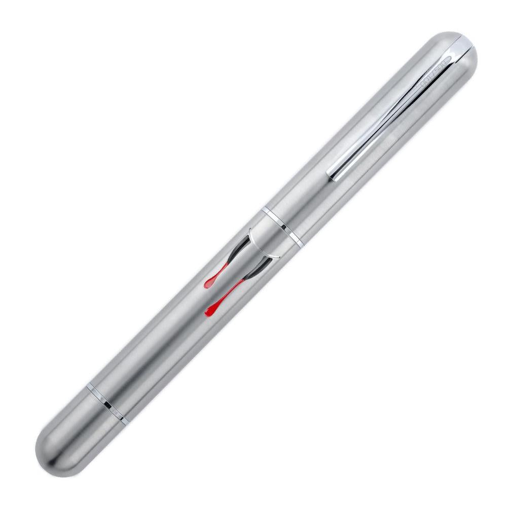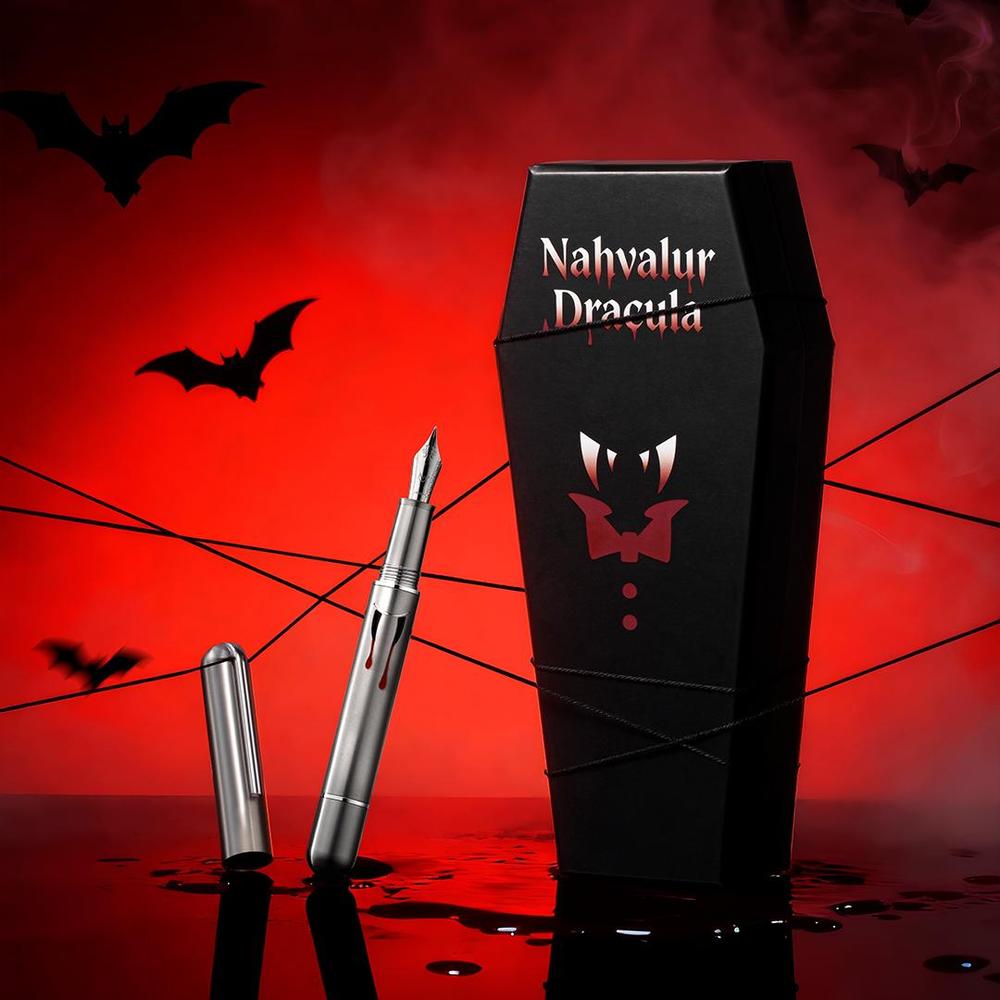 Introducing Nahvalur: Dracula—a striking titanium fountain pen designed to captivate attention. Crafted on Nautilus Ti platform, this elegant metal pen features uniquely shaped fang-inspired ink windows that reveal the ink reservoir inside. Its exterior is adorned with meticulously hand-applied lacquer droplets resembling blood, adding a glossy, tactile detail that shimmers under display lighting. The presentation box enhances the experience, allowing the pen to unmistakably “rise from the grave,” offering a memorable unboxing and an engaging display moment.