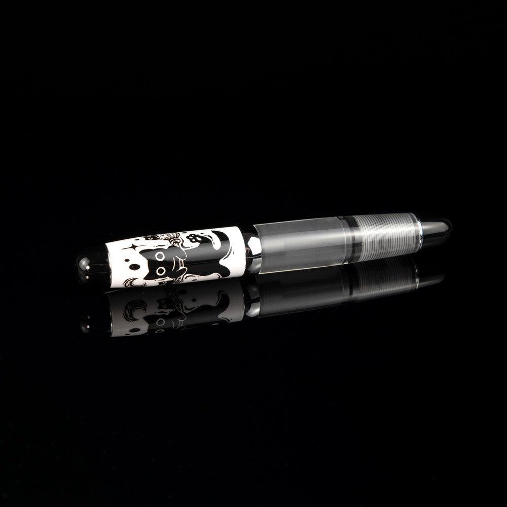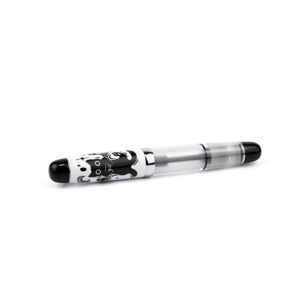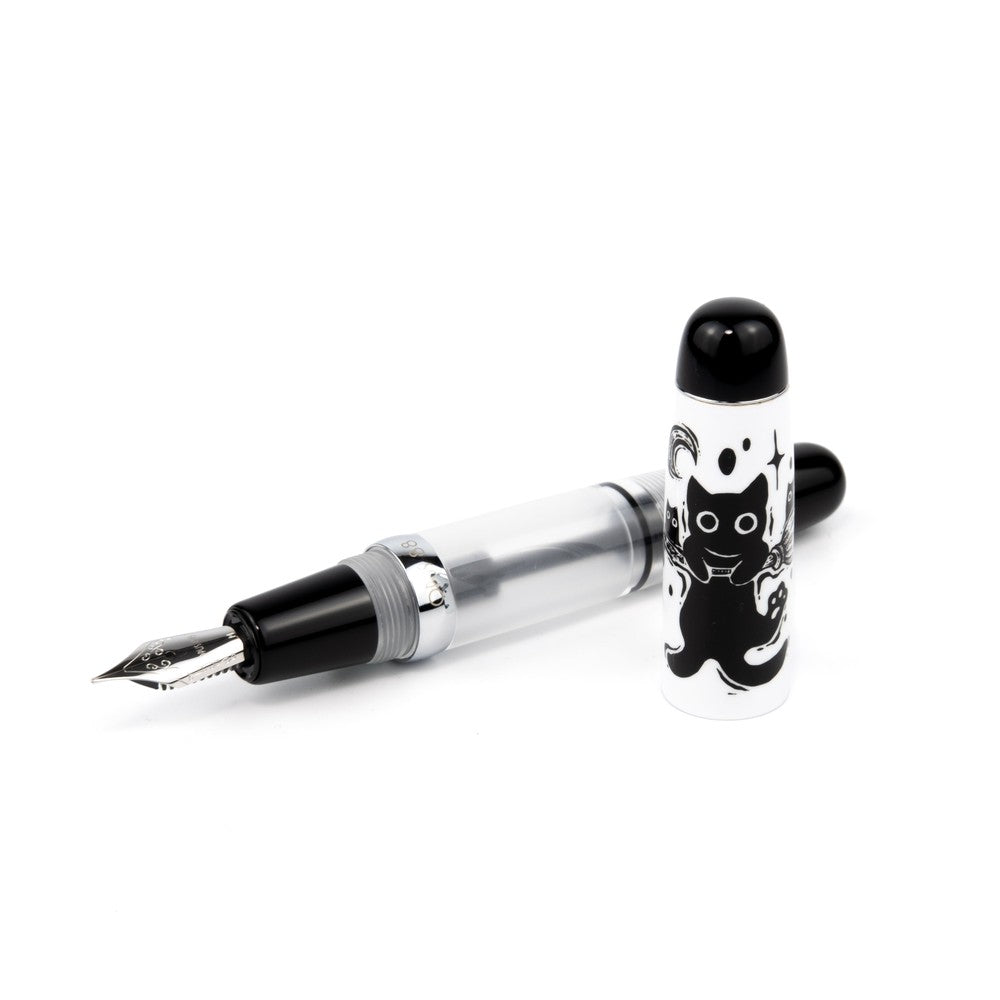 The Opus 88 ×@valio_art Broom Cat Fountain Pen features a charming broom cat illustration on its cap and comes with a stainless steel nib and can be filled by ink using the eyedropper included in the box. It is a compact and exclusive mini pocket pen perfect for daily use.