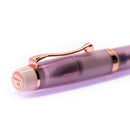 The Opus 88 Harmony 2025 Mocha Mousse fountain pen is designed in an eyedropper style, boasting rose gold-plated trimmings and a matching stainless steel nib with a rose gold finish. Its translucent pinkish purple resin body and cream grip sections add a touch of elegance to the overall design.