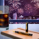 This pen features a stunning brown marble finish that glimmers with an enthralling pearlescent sheen. A transparent amber window near the grip section lets you see how much ink is in the pen. The design is complemented by gold-colored trim and a stainless steel nib engraved with the Pelikan logo.