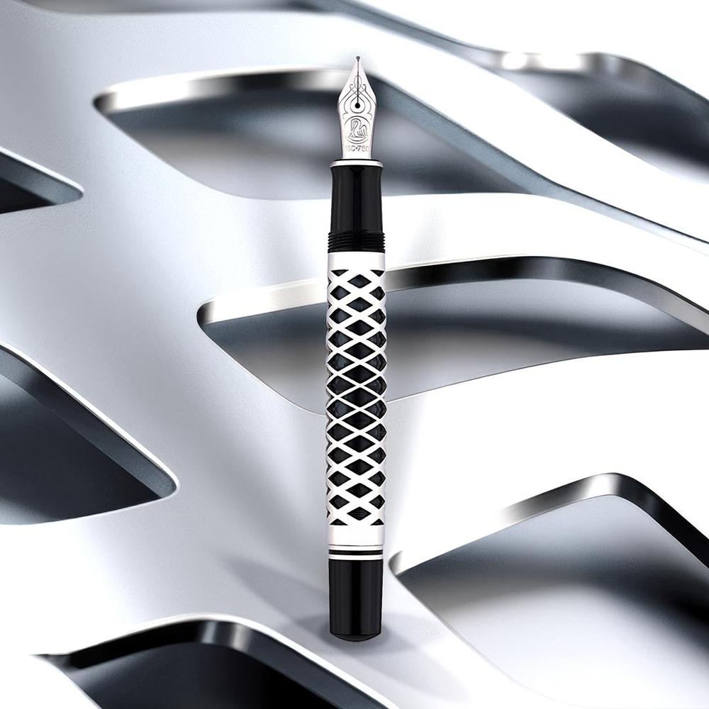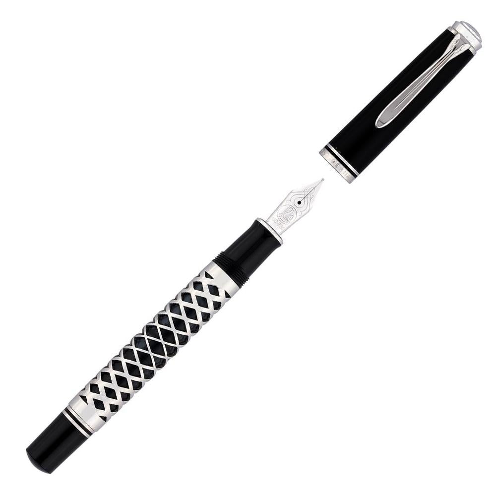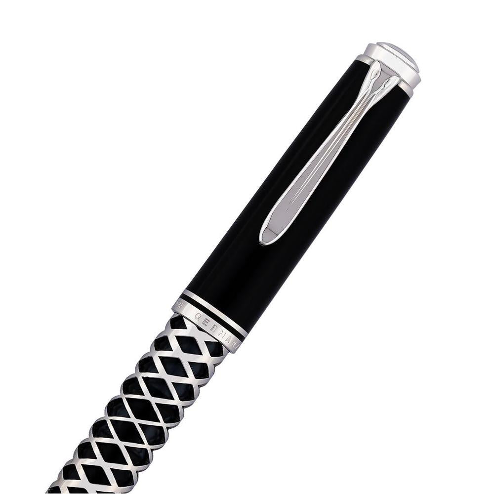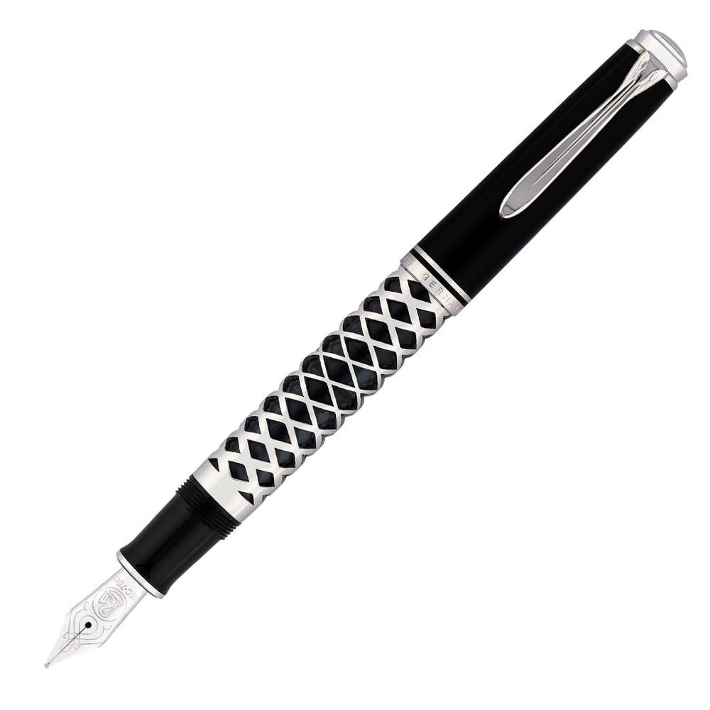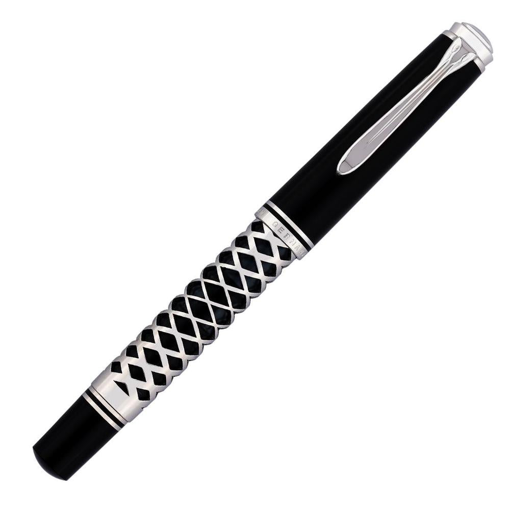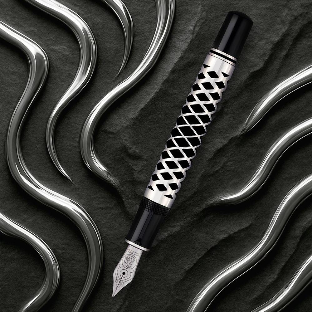The 2025 Special Edition M805 Metal Sleeve showcases a polished black acrylic barrel wrapped in an intricately laser-cut silver sleeve, merging refined elegance with captivating geometric detail. Equipped with Pelikan’s renowned piston-filling mechanism and an 18k rhodium-plated gold nib, it ensures impeccable ink delivery and a seamless writing flow. Beyond functionality, this pen embodies a harmonious fusion of craftsmanship and innovation.