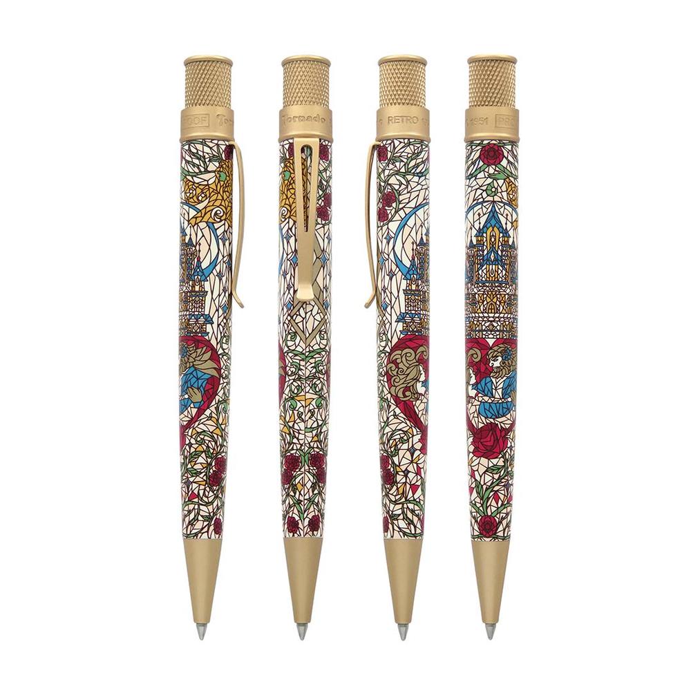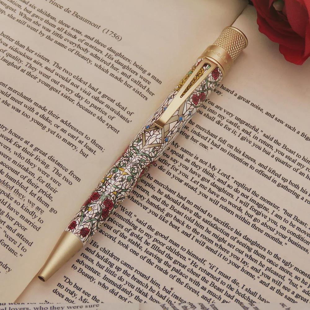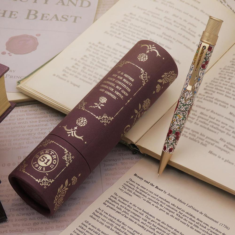 The newest addition to Retro51’s Literary Collection, Beauty and the Beast features a stained-glass–inspired design. The illustrated scene is framed within a heart, capturing Beauty and the Beast alongside the witch’s curse, the enchanted castle, and the iconic rose—symbols of love, transformation, and the passage of time. Accented with cream-gold metallic trim and topped with a sculpted rose finial, this rollerball pen is housed in a burgundy collector’s tube with gold foil details—regal, refined, and ready to be treasured.