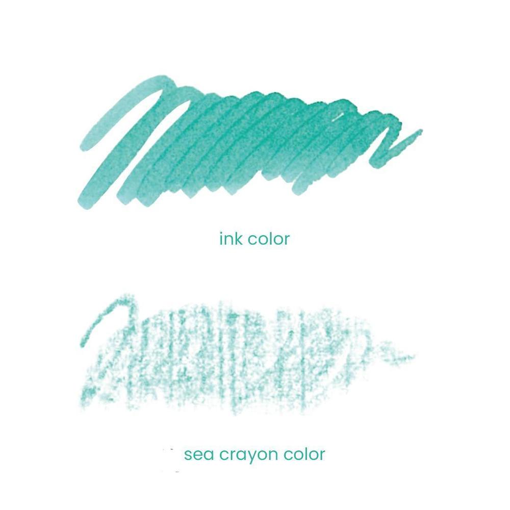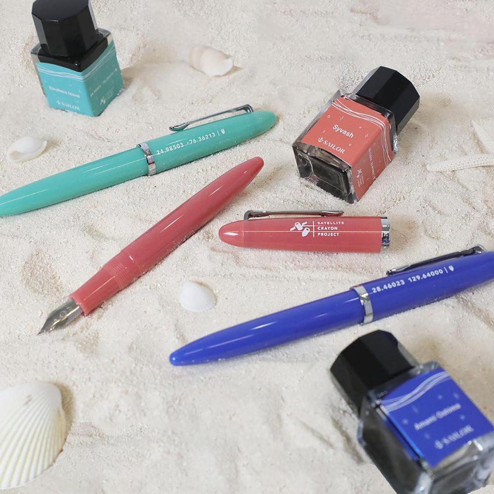 This collection features fountain pens and ink in colors that represent the exquisite hues of seawater as seen in satellite photos, especially: