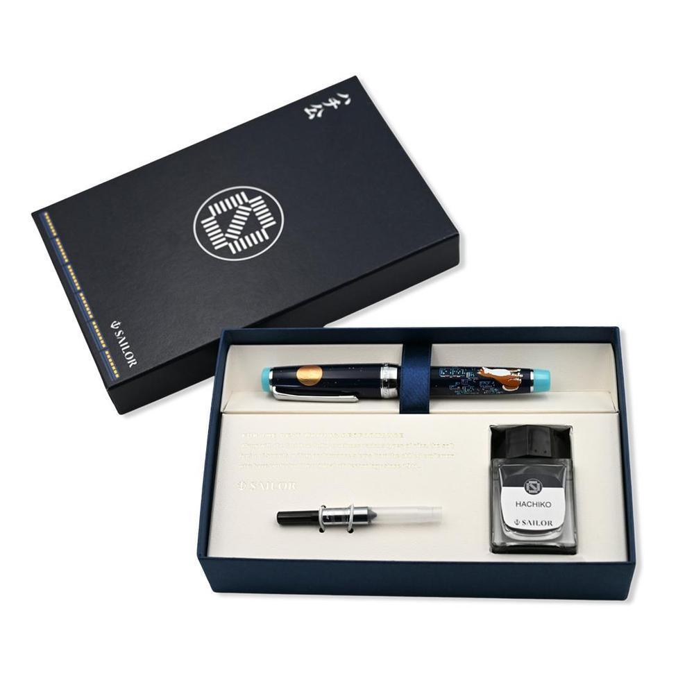 The Pro Gear Hachiko fountain pen is equipped with a large-sized 21K gold nib. Its resin body, enhanced with rhodium accents, showcases a Yuubi Maki-e illustration of the renowned Akita Inu, Hachiko, who faithfully waited for his master at Shibuya station for almost a decade. Additionally, the pen includes a distinctive top cap design featuring a unique serial number engraved on the cap ring.
