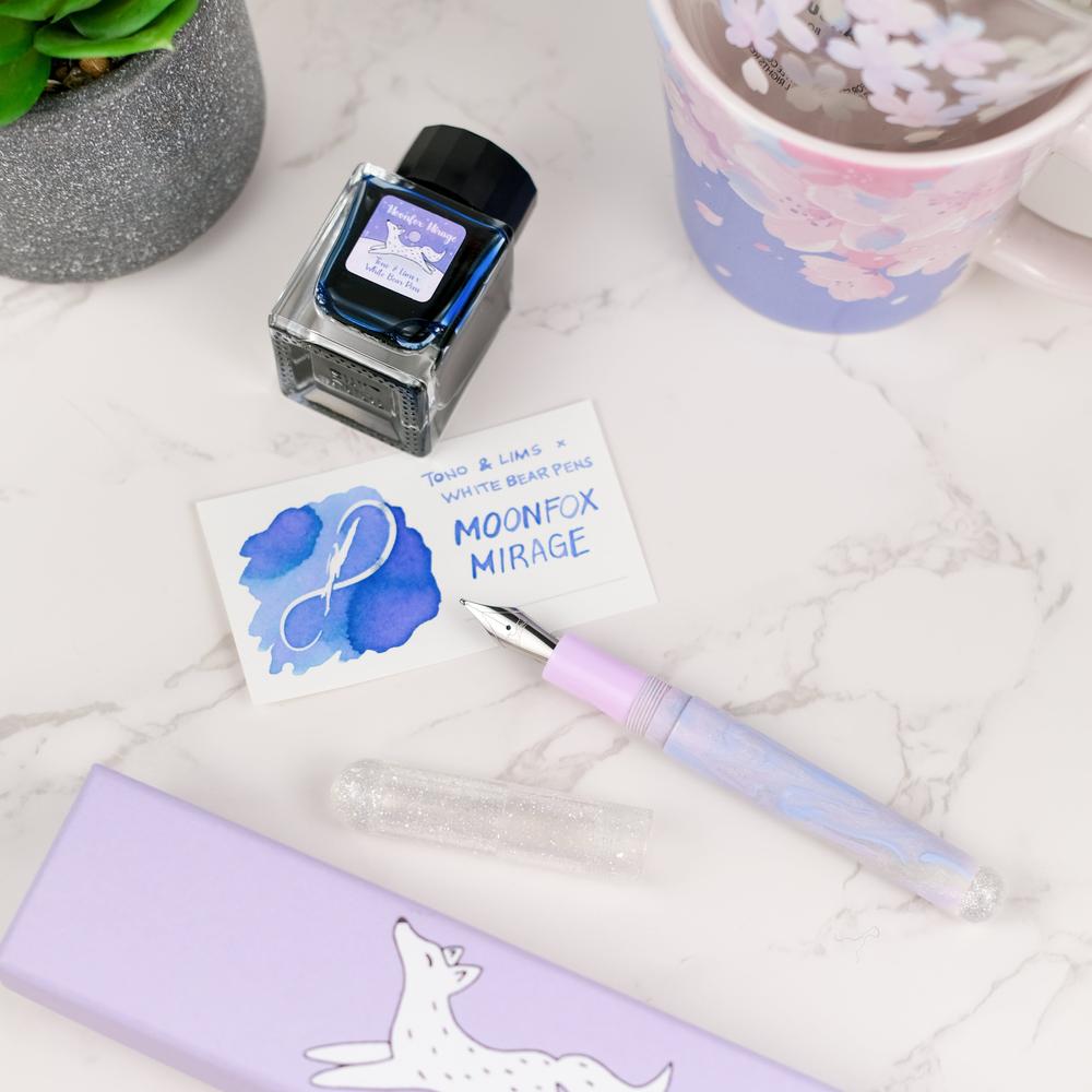 Discover Moonfox Mirage, a stunning collaboration between Tono & Lims and @whitebearpens. This 30ml ink bottle features a captivating periwinkle hue designed to complement the Arctic Fox pen with remarkable depth and legibility. What makes it truly special is the hidden chromashading magic—soft lavender undertones shimmer through as you write, creating an enchanting interplay of color. Peaceful yet whimsical, this ink transforms everyday writing into a delightful experience. Housed in a quality glass bottle, Moonfox Mirage brings both sophistication and wonder to your pen collection.