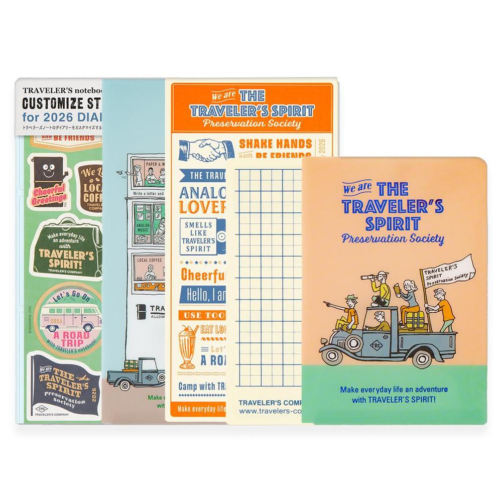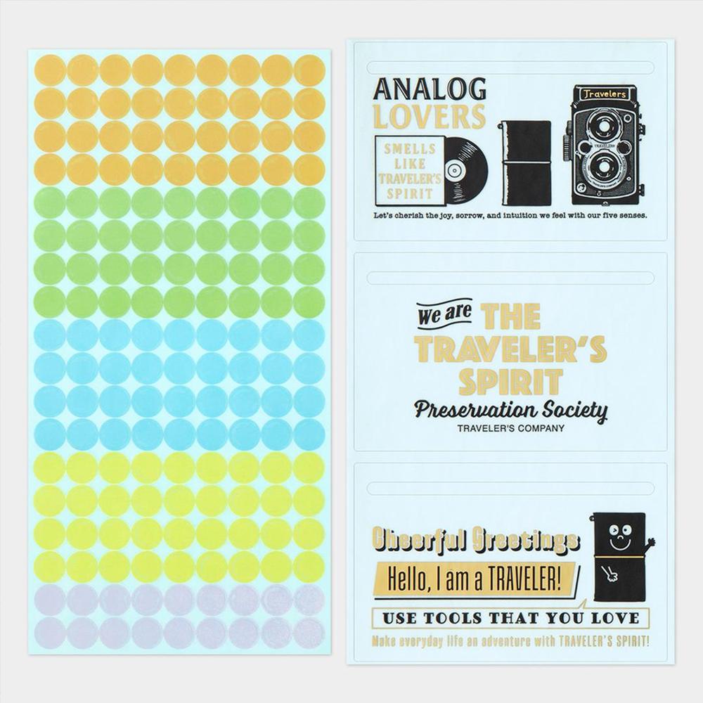 Sticker Set – A curated collection designed to personalize your TRAVELER’S notebook with style and function, featuring index and pocket labels, icons for organizing plans, dry transfer decals, and decorative stickers for the cover.