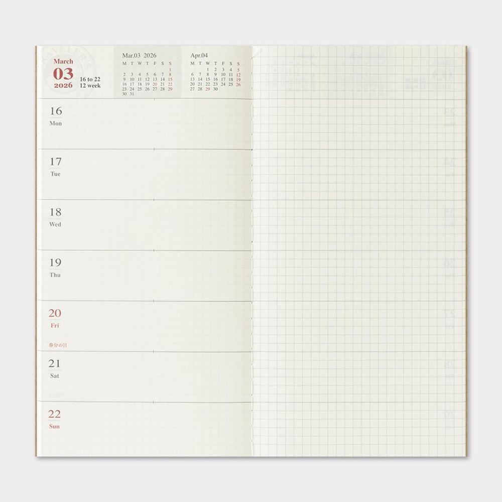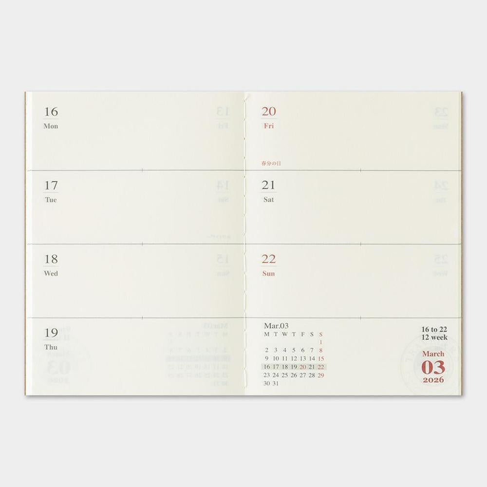 This format pairs your weekly schedule on the left with a gridded memo page on the right — perfect for notes, sketches, or to-do lists. One notebook covers six months. Includes a Guide and a customizing sticker to help make your 2026 planning personal and fun. Printed on MD paper for an exceptional writing feel.