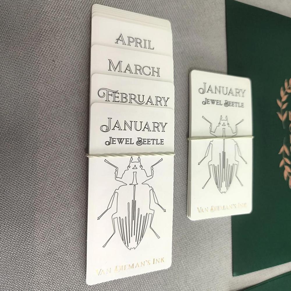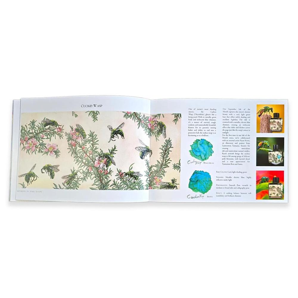 Belinda’s artworks have become a cornerstone of these collections, and for 2025 she was joined by Ryan Rivers and the Van Dieman’s team for two of the pieces. Every artwork is printed in vibrant color in a landscape booklet designed exclusively for this release. Alongside each piece is a detailed write up about the insect that inspired it and the formulation behind its matching ink. It is our most beautiful booklet to date.