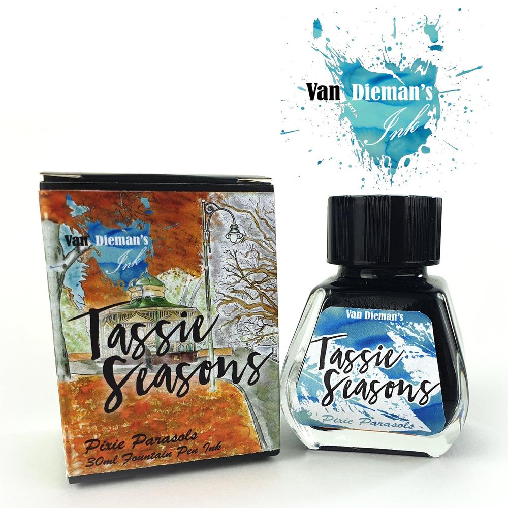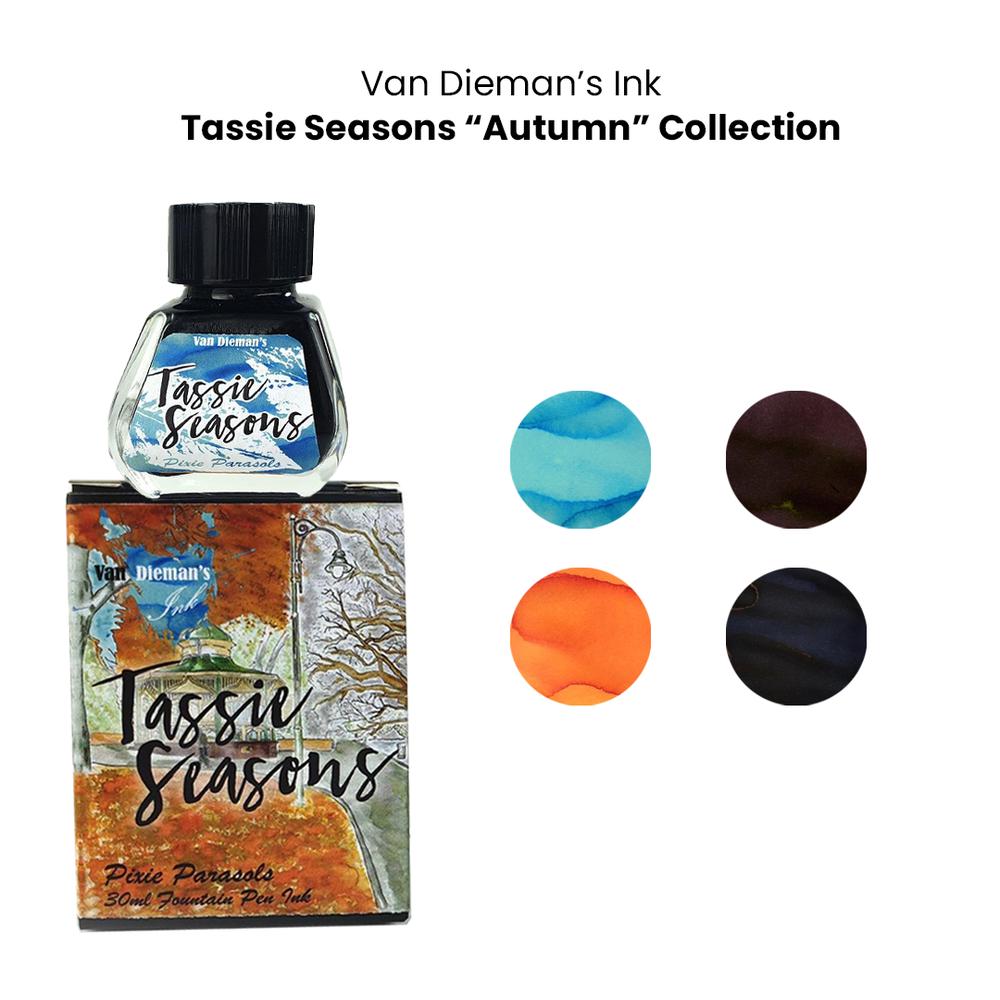 Tassie Seasons is the fifth series in Van Dieman's expanding collection of Tasmanian Fountain Pen Inks. These sixteen inks encapsulate the changing colours of Tasmania, with four inks dedicated to each season. Tassie Seasons is a mix of dark and light, warm and cool, every-day writing worthy and artistically minded colours, including two shimmer inks.