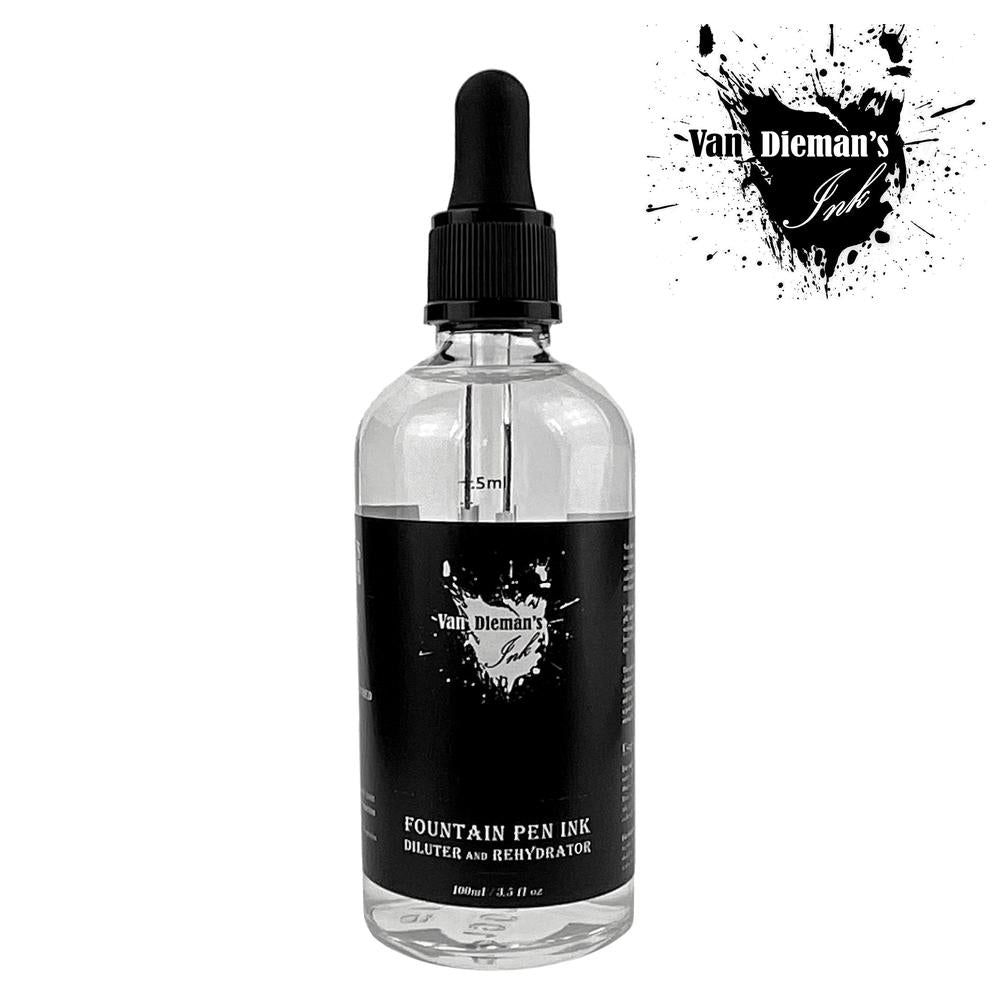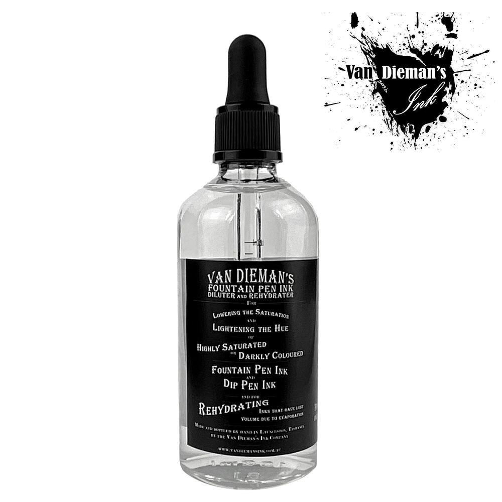 Van Dieman’s Fountain Pen Ink Diluter and Rehydrator is a multi-purpose fluid for desaturating highly saturated inks, lightening the tone of darkly coloured inks and rehydrating inks that have lost volume and thickened due to evaporation.