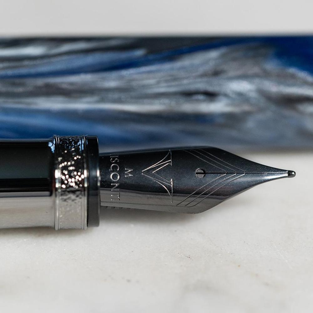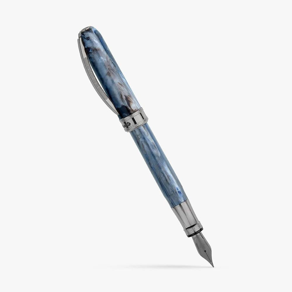 Inspired by Charon, the legendary ferryman of the underworld, the Visconti Comedìa Caronte embodies mythological darkness through its striking aesthetic. This sophisticated fountain pen features a resin body rendered in deep blues, charcoal greys, blacks, and burnished copper tones—each hue evoking the turbulent rivers, shadowed stone, and infernal flames of ancient lore. A hammered central band, engraved with the series and canto designation, serves as a refined focal point. The substantial steel nib, precisely plated to harmonize with the metalwork, delivers a refined writing experience. The magnetic closure ensures secure closure, while the signature spring-loaded bridge clip—inspired by Florence's architectural heritage—completes this distinguished writing instrument. Accepts standard international cartridges and converters.
