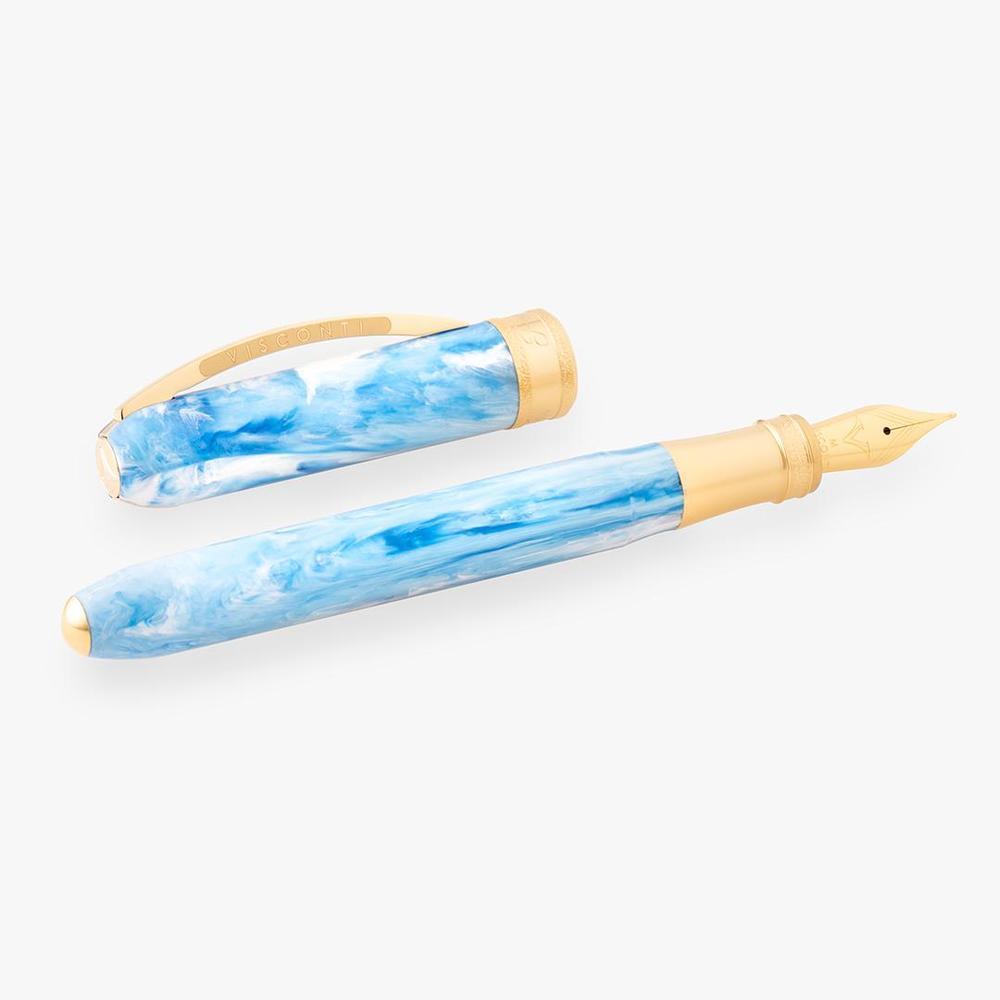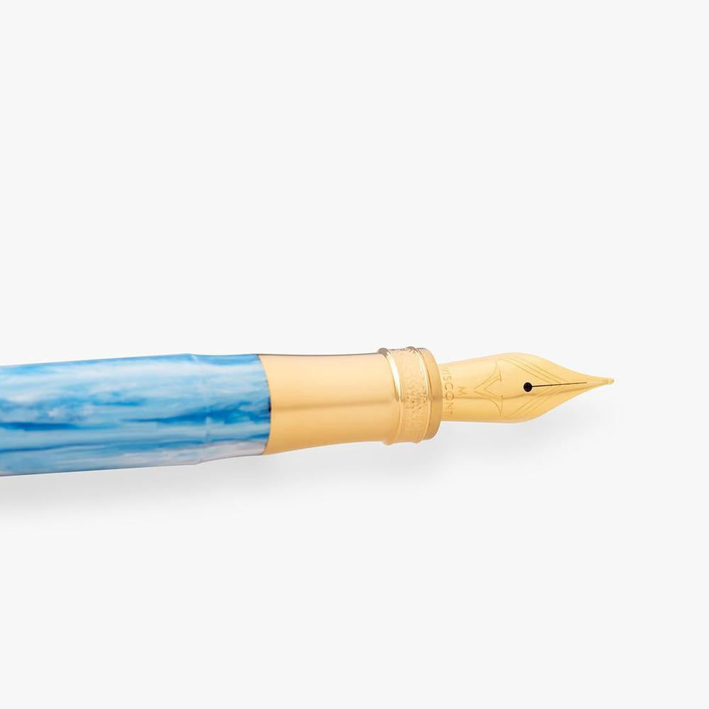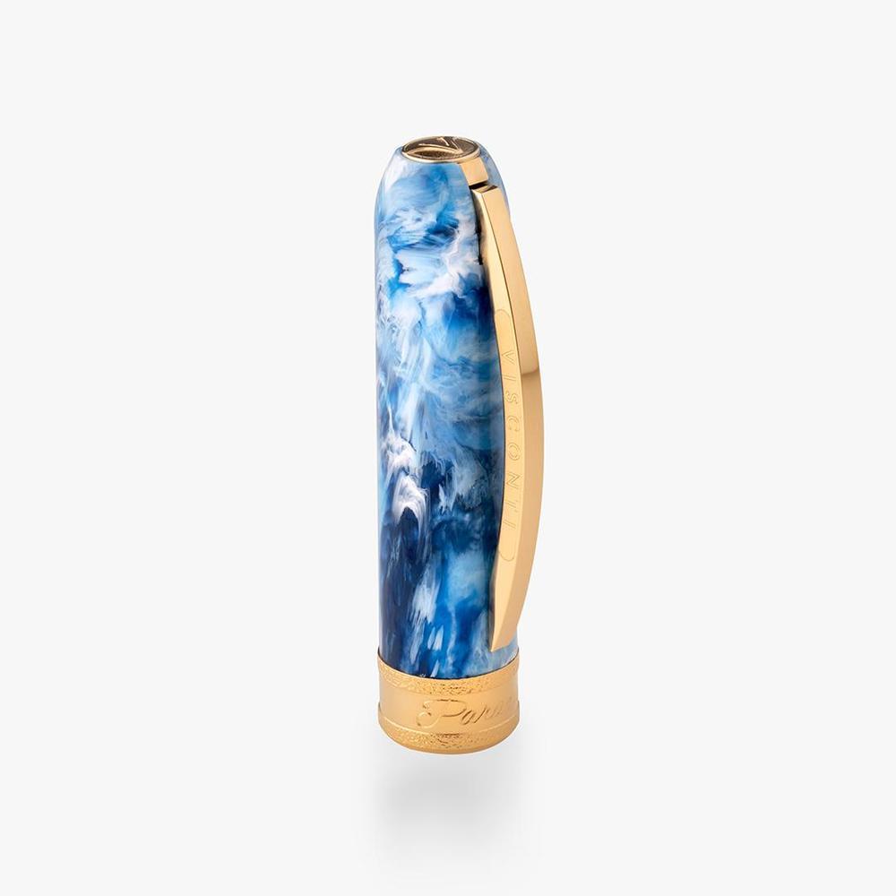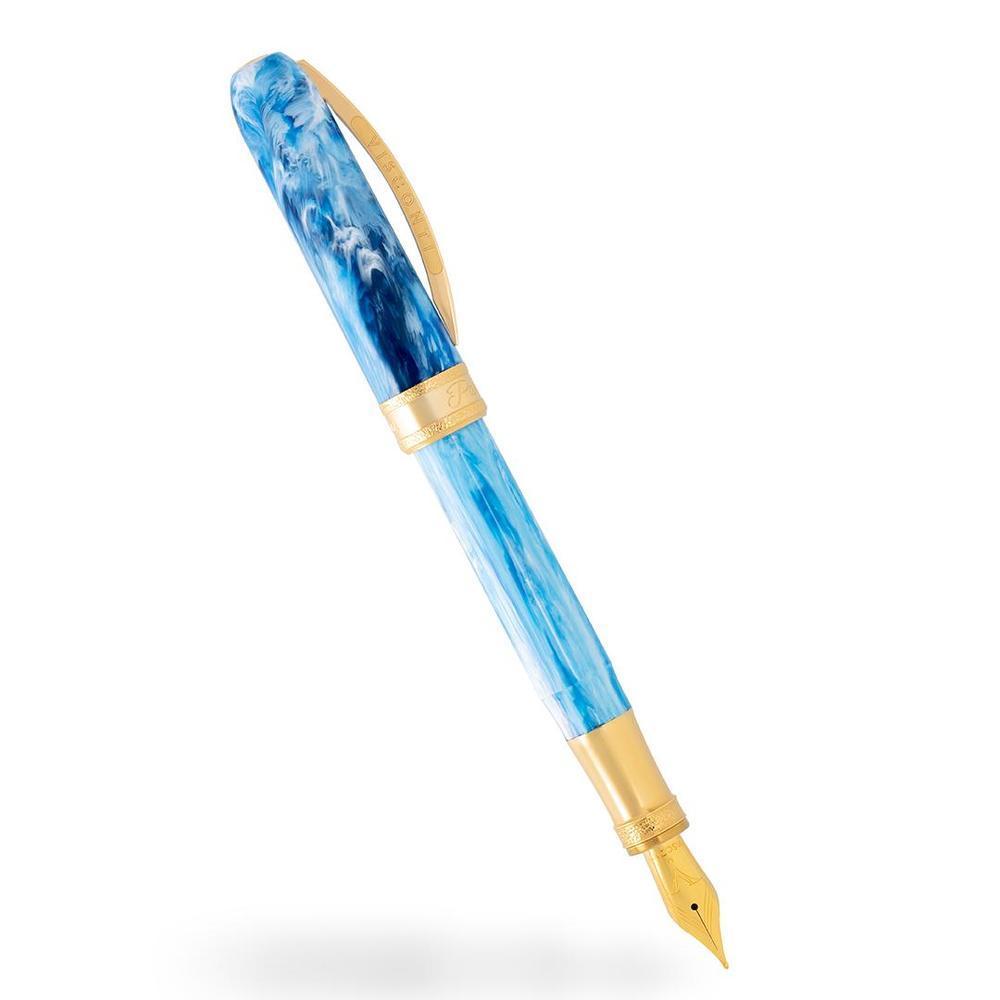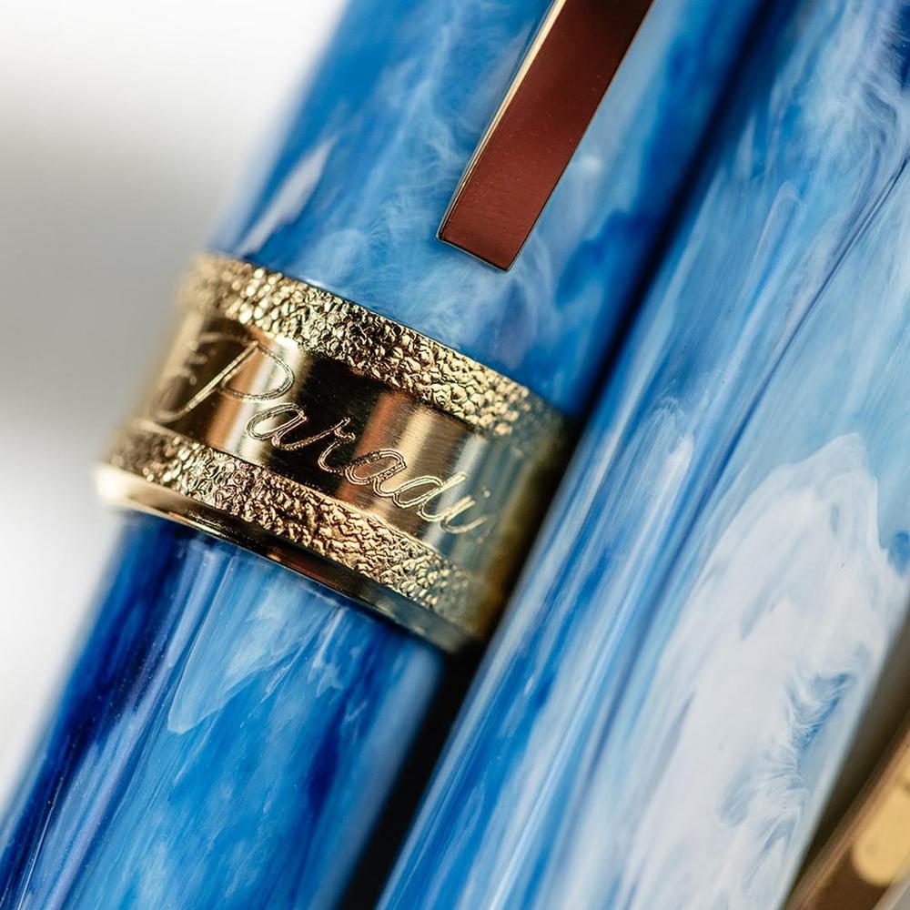 Visconti's Comedìa Paradiso fountain pen translates Dante's vision of the divine into tangible elegance. Rendered in celestial sky blue resin with luminous yellow gold accents, this writing instrument evokes the radiant splendor and transcendent beauty of paradise. A hammered central band, engraved with the series and canto designation, serves as a refined focal point. The substantial steel nib, precisely plated to harmonize with the metalwork, delivers a refined writing experience. The magnetic closure ensures secure closure, while the signature spring-loaded bridge clip—inspired by Florence's architectural heritage—completes this distinguished writing instrument. Accepts standard international cartridges and converters.