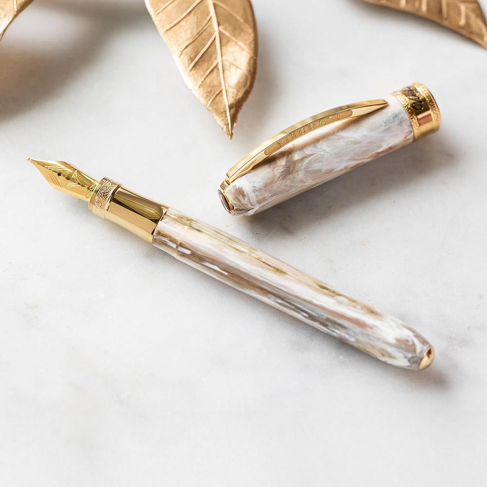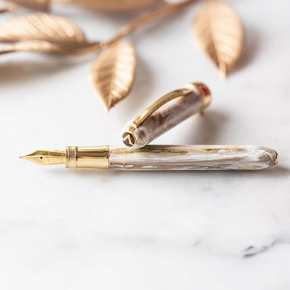 Drawn from Dante Alighieri's literary masterpiece, the Visconti Comedìa Virgilio fountain pen honors the Roman poet who guided Dante through Inferno and Purgatorio. The pen's refined acrylic resin body showcases an elegant palette of ivory, sand, copper and muted white tones, each hue reflecting distinct facets of Virgil's character. Lustrous yellow gold-plated accents grace the clip, cap band, and grip section.