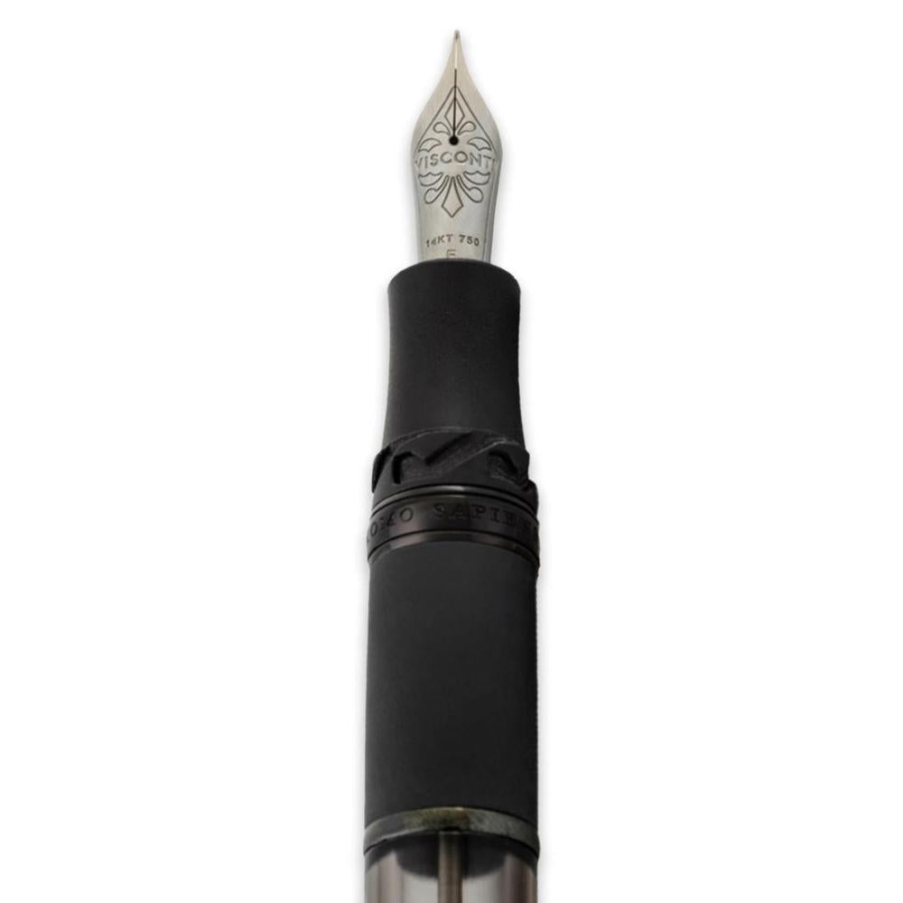 Crafted with meticulous artisan precision, the Visconti Homo Sapiens Dark Crystal transforms writing into an experience. Its transparent smoked resin barrel showcases exceptional craftsmanship, while the shiny black brass clip and ivory-backed logo add sophisticated contrast. Every component—from the hand-polished metalwork to the velvety-soft resin finish—reflects Visconti's dedication to detail. The revolutionary Hook Safe Lock capping system keeps your pen secure, no accidental leaks allowed. Powered by a titanium vacuum filler and crowned with an 18k gold ruthenium-plated nib, this fountain pen delivers both elegance and performance.