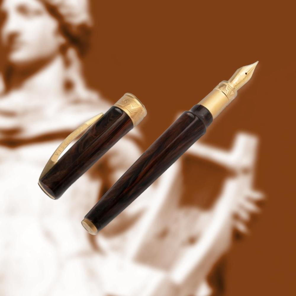 The Apollo fountain pen showcases a striking design paired with a large gold-plated stainless steel nib for smooth, expressive writing. The pen features a convenient magnetic closure and accepts both cartridges and converters for easy refilling. Crafted with brass and yellow gold metalwork finished in satin, it's a sophisticated tribute to divine artistry.
