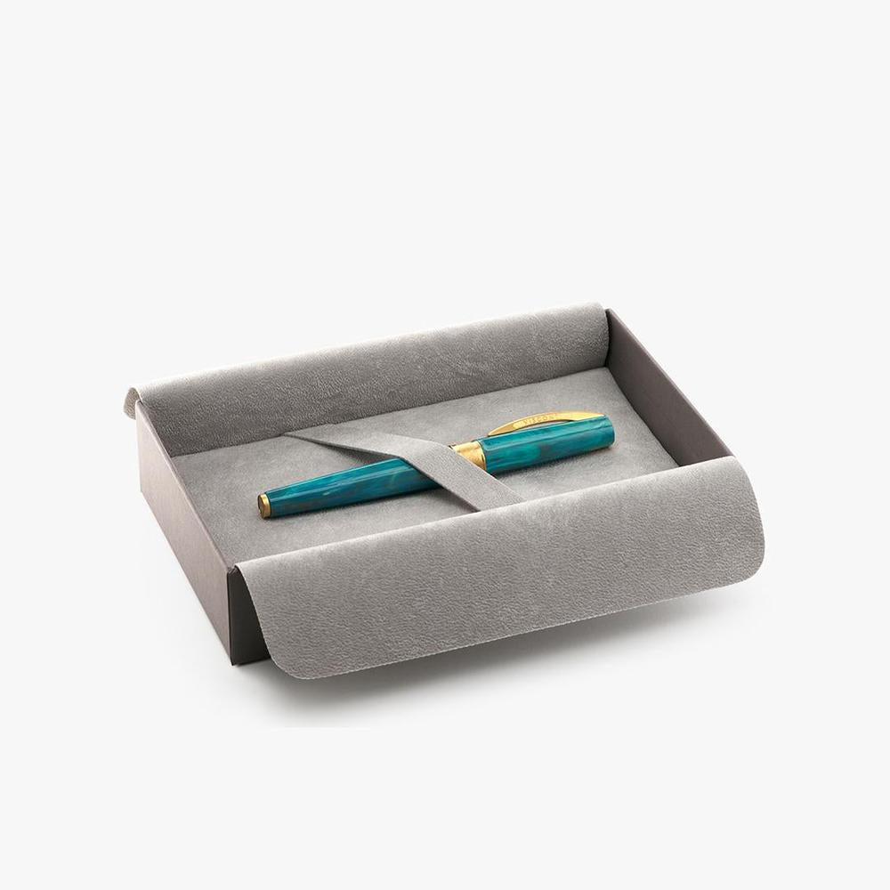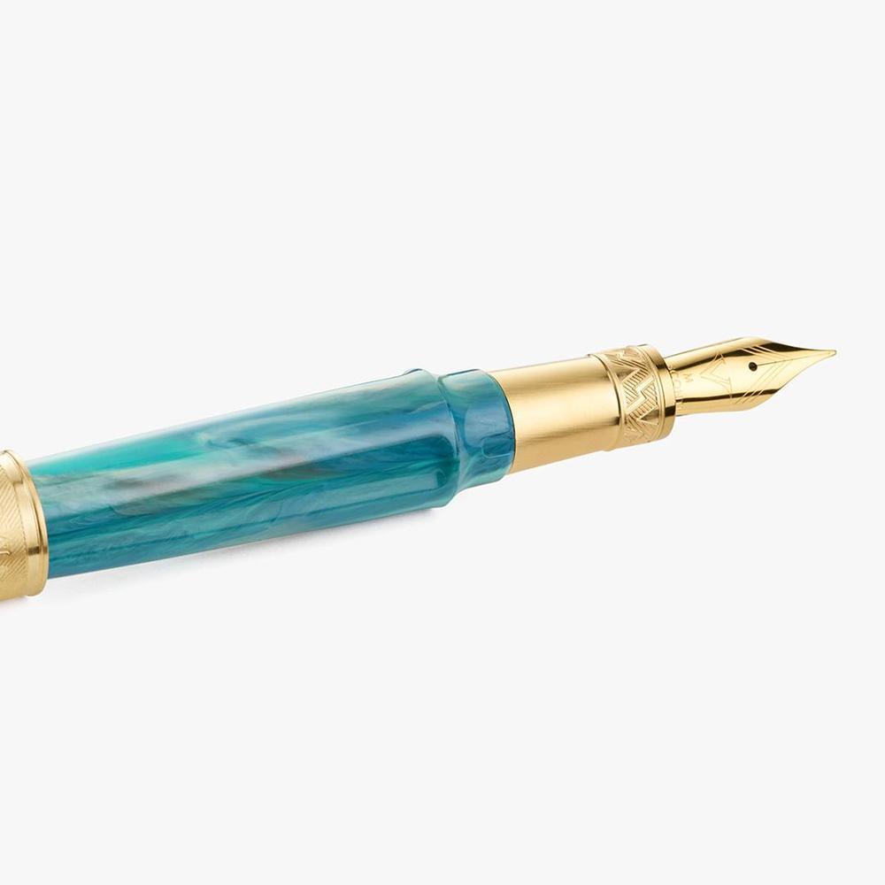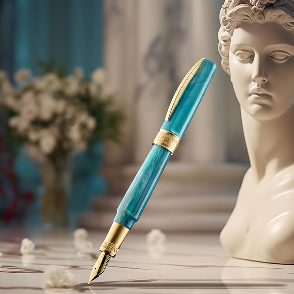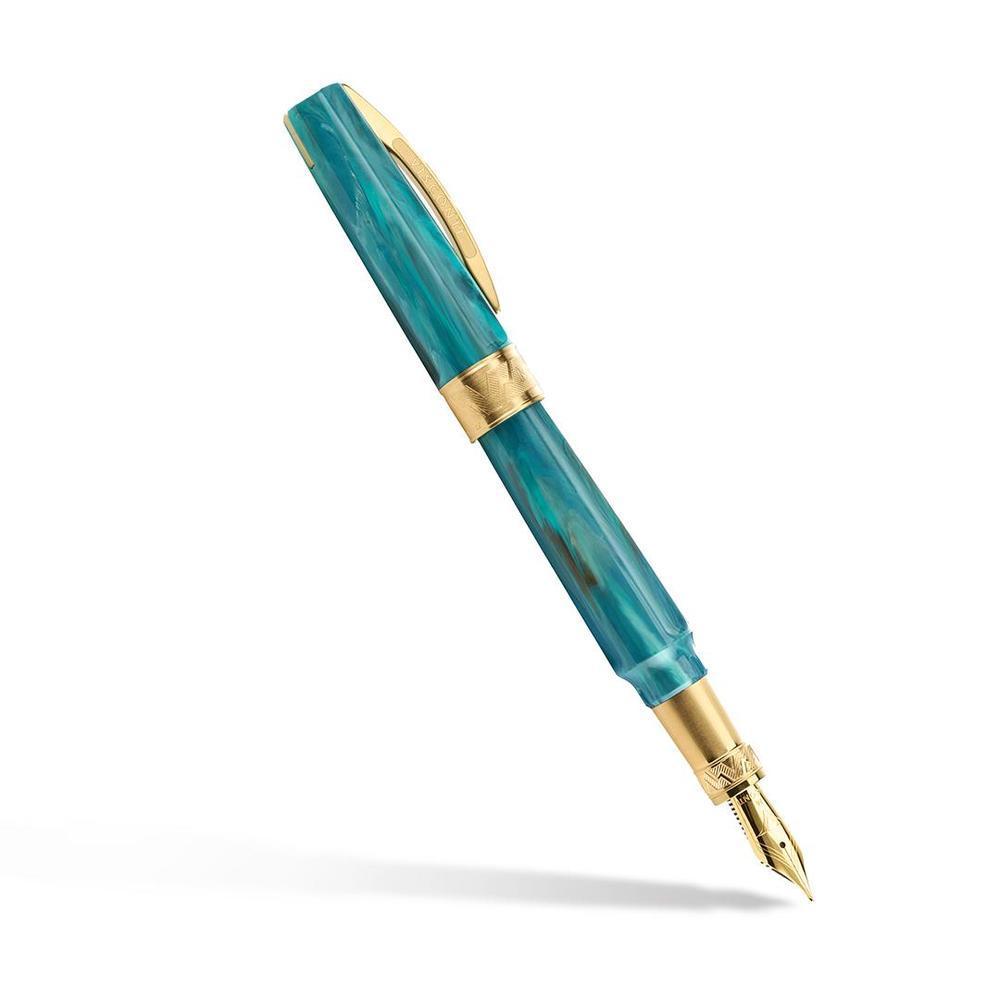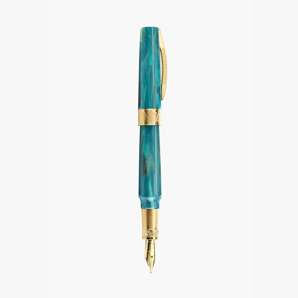 Inspired by the Greek goddess of wisdom, the Visconti Mirage Mythos Athena features a captivating swirled turquoise resin with bronze undertones and elegant gold-plated accents. This sophisticated fountain pen comes equipped with a large stainless steel nib, convenient cartridge/converter system, and a secure magnetic cap.