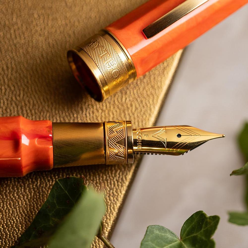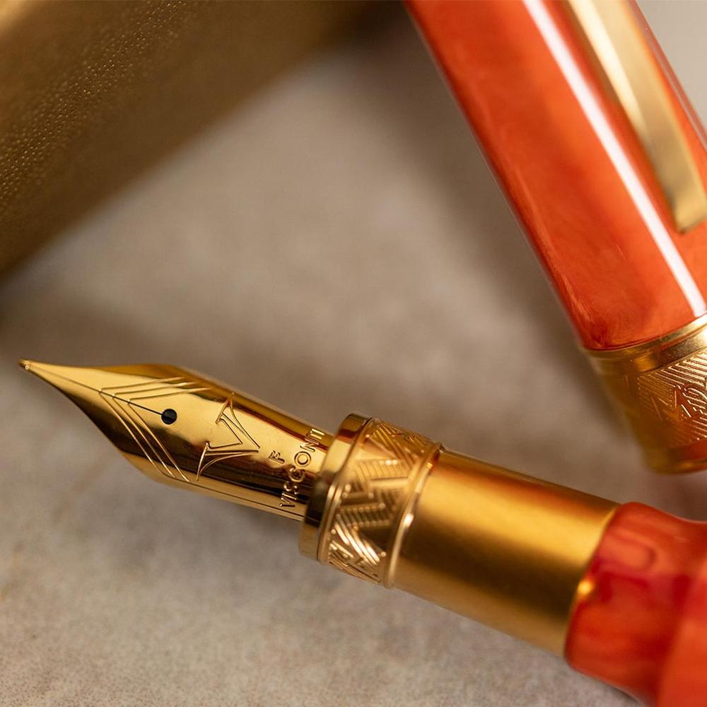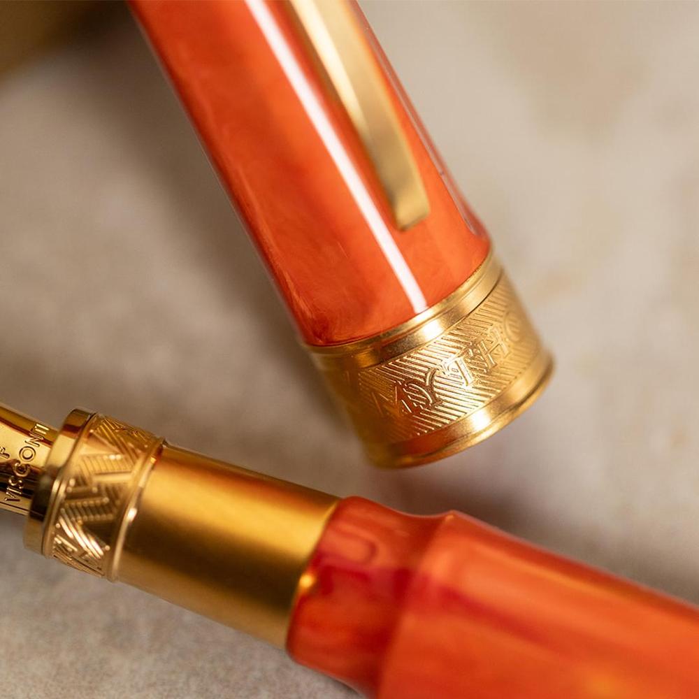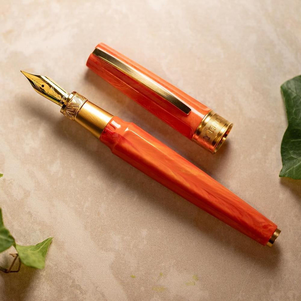 Demeter fountain pen brings mythological elegance to your writing. Its vibrant orange resin body with golden swirls pairs beautifully with yellow gold-plated trims and a large steel nib. The magnetic twist-and-snap cap closure and signature spring-loaded clip ensure reliable performance, while engravings celebrating the Mirage Mythos collection add a touch of sophistication. Perfect for collectors and everyday writers alike.