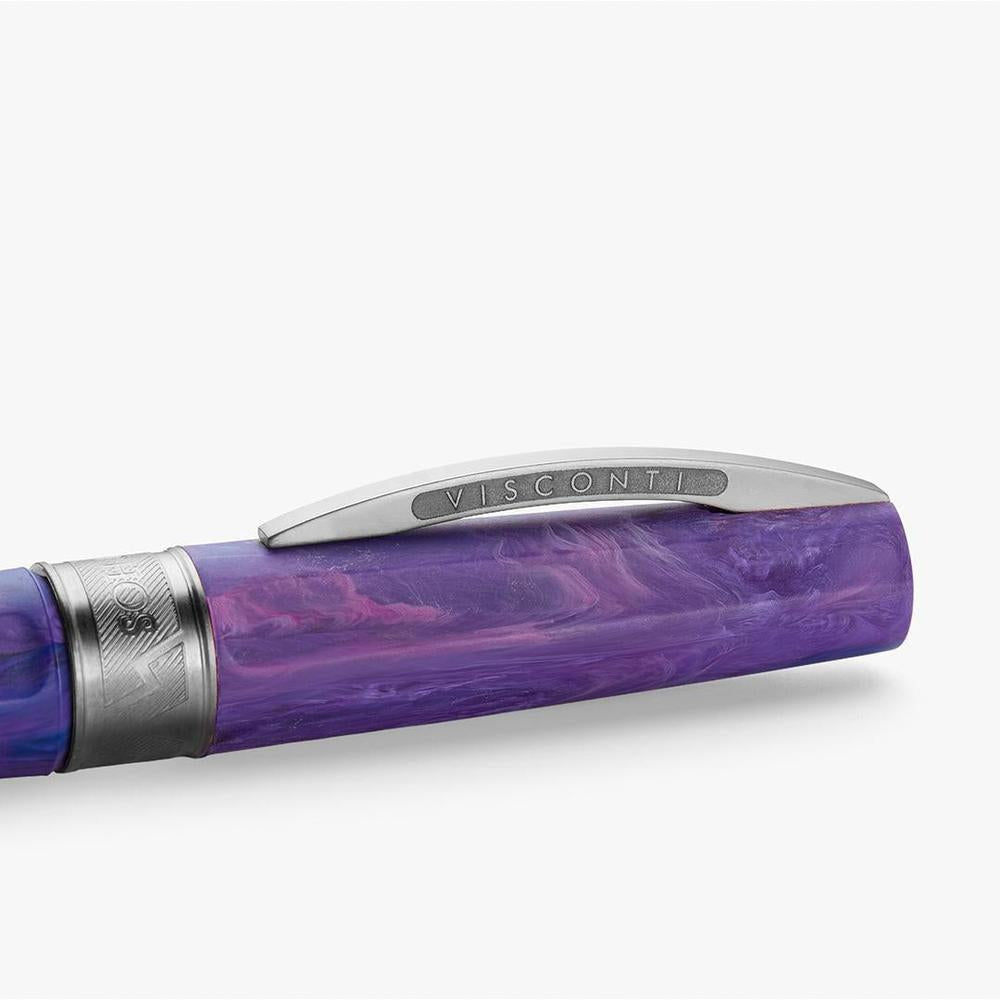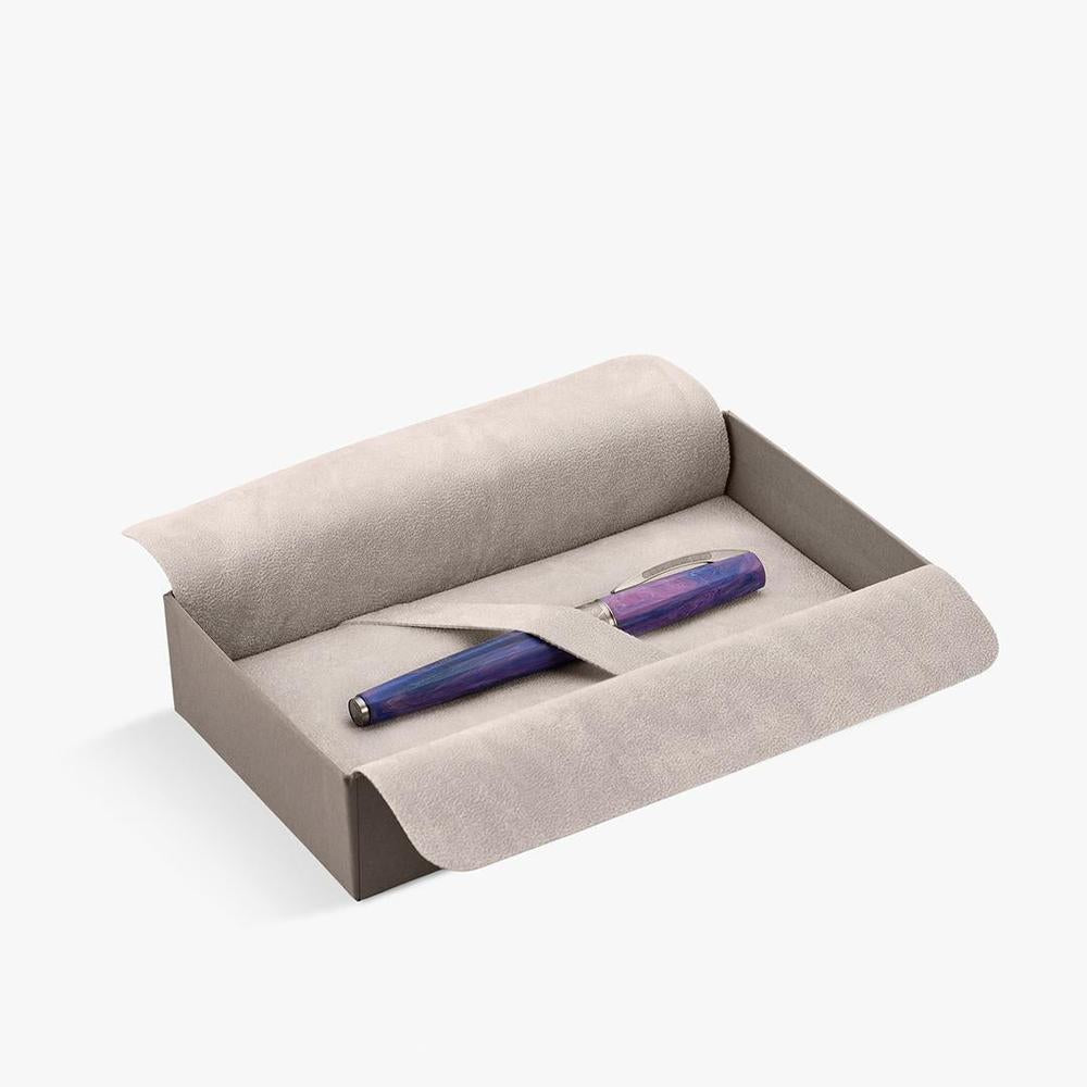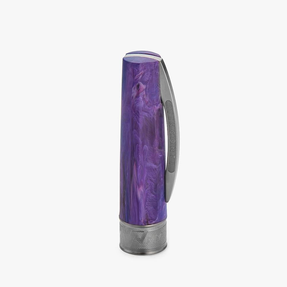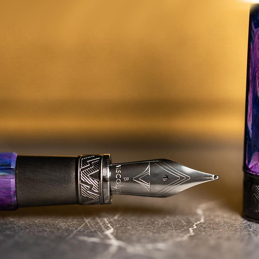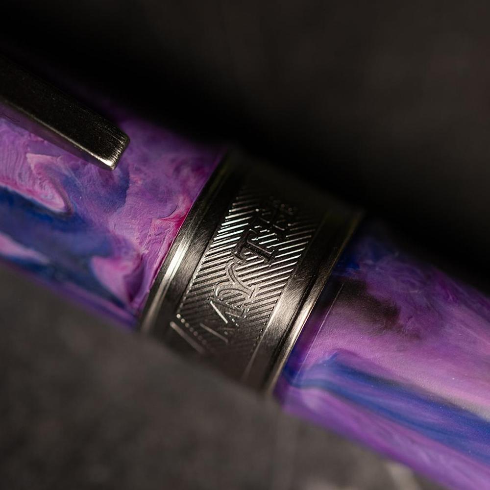 fountain pen captures duality through its enchanting matte violet, purple and deep blue resin adorned with sleek ruthenium accents. This distinctive pen features a ruthenium-finished steel nib, magnetic closure mechanism, and Visconti's iconic spring-loaded clip. The center band bears the "MYTHOS" inscription and stylized Mount Olympus symbol, celebrating the eternal cycle of transformation and renewal.