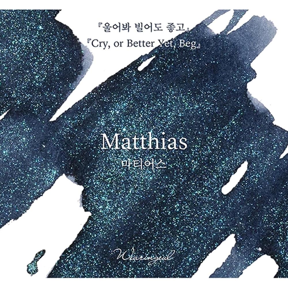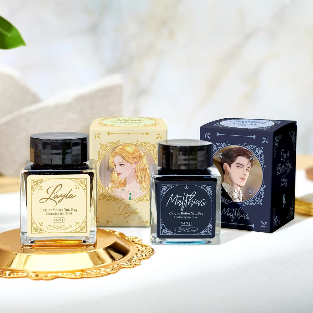 An ink that captures the cool rationality of Matthias von Herhardt, who wishes for everything to flow perfectly within a fixed order, along with eyes resembling a sky where night is giving way to dawn, Set upon a deep navy base, mysterious blue glitter shimmers, evoking Matthias's gaze as it followed Leila's movements through the darkness.