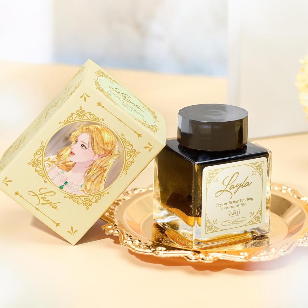 An ink that captures the warm, gentle heart of Leila Llewelyn, who loves forests and birds, along with her golden hair shimmering in reflected sunlight, Formulated with a calm, soft beige base ink and enhanced with sparkling gold glitter, it evokes the warmth of a small bird—a canary.