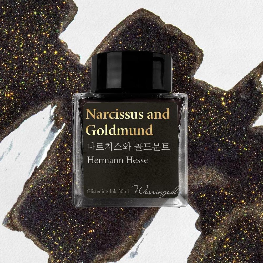 An ink where brilliant gold glitter shines over a deep black base, expressing the contrast between Narcissus's restrained intellect and Goldmund's free-spirited sensitivity through the interplay of light and darkness.