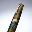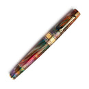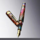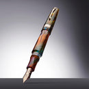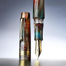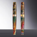 Crafted from the renowned Primary Manipulation 5 material, the Leonardo Supernova 2025 fountain pen showcases an integrated piston mechanism—a testament to the exceptional collaboration between Leonardo Officina Italiana and Jonathon Brooks, widely regarded as one of the world's most innovative resin artisans. This limited edition masterpiece evokes the celestial brilliance of a stellar explosion through its sophisticated palette of warm plum, purple, magenta, and orange hues, delicately accented with cool green, cyan, and blue undertones. Technical features include a transparent ink window on the section for monitoring fill levels and a precision-engineered piston mechanism with 1.5ml capacity.
